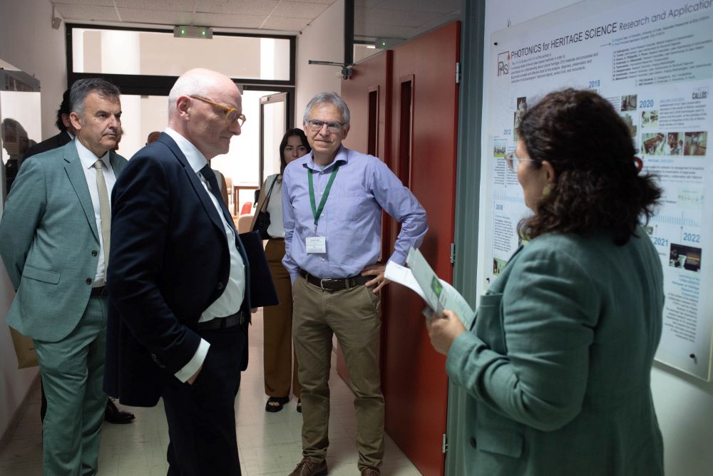 Ακολούθησε επίσκεψη σε ερευνητικά εργαστήρια του Ιδρύματος. Στο Ινστιτούτο Ηλεκτρονικής Δομής και Λέιζερ ο Πρέσβης ενημερώθηκε για την ερευνητική δραστηριότητα της ομάδας «Εφαρμογών Φωτονικής στην Πολιτισμική Κληρονομιά- PhoHS» αναφορικά με την χρήση των λέιζερ στην ανάλυση, διάγνωση και συντήρηση ιστορικών μνημείων και έργων, εστιάζοντας σε συνεργασίες της ερευνητικής ομάδας PhoHS με γερμανικούς ακαδημαϊκούς και ερευνητικούς φορείς. Επισκέφθηκε επίσης την Ομάδα Κβαντικού φωτός και τεχνολογιών, που αποτελεί ερευνητική εγκατάσταση τεχνολογίας αιχμής, όπου δόθηκε έμφαση στη σημασία των πρωτοποριακών αποτελεσμάτων του εργαστηρίου στη βασική έρευνα, στις κβαντικές τεχνολογίες αλλά και τις πιθανές εφαρμογές τους στο περιβάλλον και την βιοϊατρική απεικόνιση.