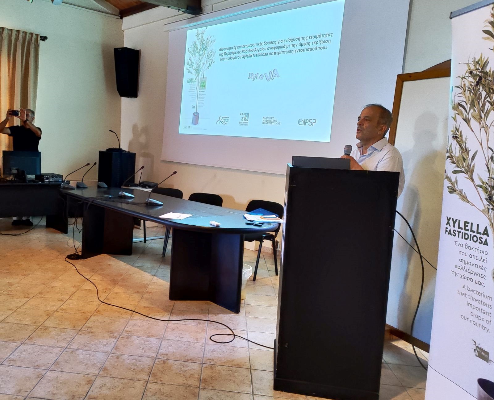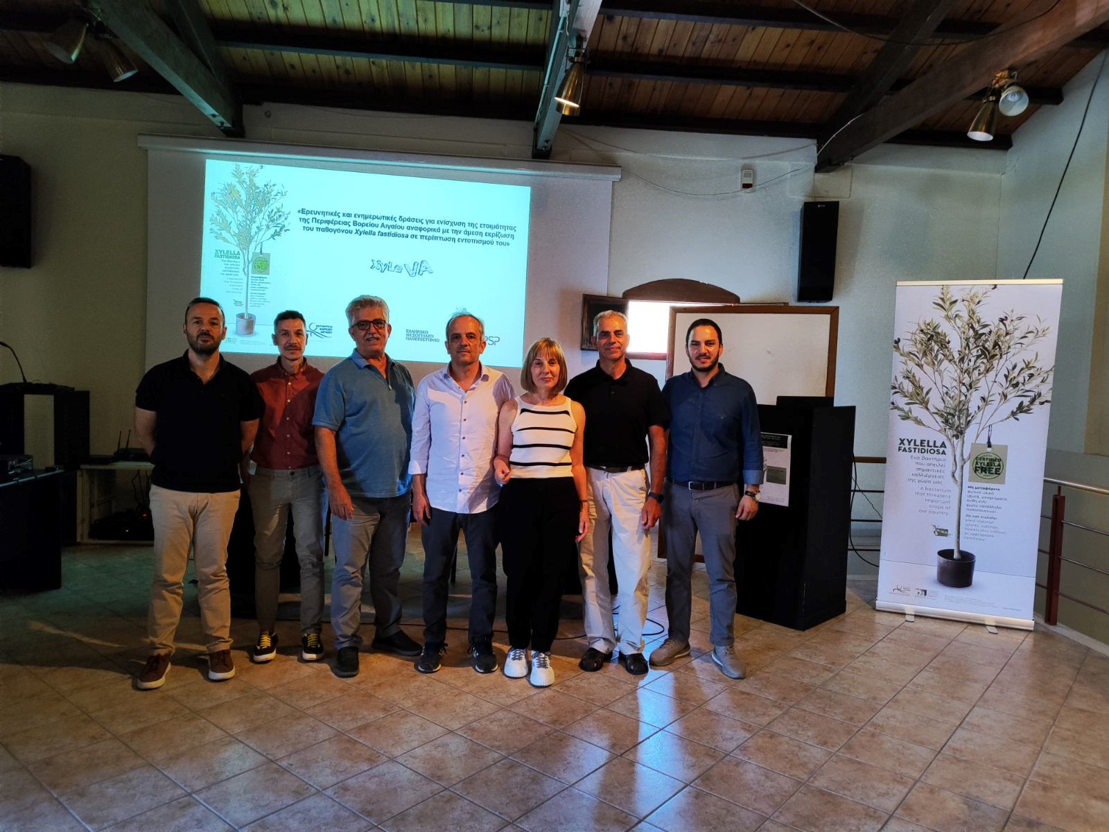 Η ενημερωτική ημερίδα είχε τίτλο «Δέκα χρόνια χωρίς Xylella, η προσπάθεια συνεχίζεται χωρίς εφησυχασμό» και πραγματοποιήθηκε το Σάββατο 6 Ιουλίου στον συνεδριακό χώρο του Μουσείου Οίνου της ΕΟΣ Σάμου. Η ημερίδα, η οποία έχει ιδιαίτερη επιτυχία, εκτός της ενημέρωσης για τις δράσεις του έργου «Ερευνητικές και ενημερωτικές δράσεις για ενίσχυση της ετοιμότητας της Περιφέρειας Βορείου Αιγαίου αναφορικά με την άμεση εκρίζωση του παθογόνου Xylella fastidiosa σε περίπτωση εντοπισμού του» (ακρωνύμιο XyLeVA) περιλάμβανε και γενικότερα θέματα φυτοπροστασίας της ελιάς. Κατά τη διάρκεια της δόθηκε η ευκαιρία να συζητηθούν φλέγοντα ζητήματα φυτοπροστασίας της ελιάς. Οι επιστήμονες που συμμετείχαν στην αποστολή είχαν επίσης την ευκαιρία να κάνουν δειγματοληψίες σχετιζόμενες με τις δραστηριότητες του έργου XyLeVA. Επιπλέον, μέρος της αποστολής μετέβηκε στο διπλανό της Σάμου νησί της Ικαρίας όπου εκτός των δειγματοληψιών στο πεδίο ήρθαν σε επαφή με τους τοπικούς φορείς άλλα και μεμονωμένους παραγωγούς συζητώντας και ενημερώνοντας τους για θέματα φυτοπροστασίας της ελιάς. Οι παραπάνω δράσεις έγιναν στα πλαίσια της προγραμματικής συμβάσης με τίτλο «Ερευνητικές και ενημερωτικές δράσεις για ενίσχυση της ετοιμότητας της Περιφέρειας Βορείου Αιγαίου αναφορικά με την άμεση εκρίζωση του παθογόνου Xylella fastidiosa σε περίπτωση εντοπισμού του» (ακρωνύμιο XyLeVA) η οποία υπογράφηκε μεταξύ του ΕΛΓΟ-ΔΗΜΗΤΡΑ (Ινστιτούτο Ελιάς, Υποτροπικών Φυτών και Αμπέλου) και της Περιφέρειας Βορείου Αιγαίου.