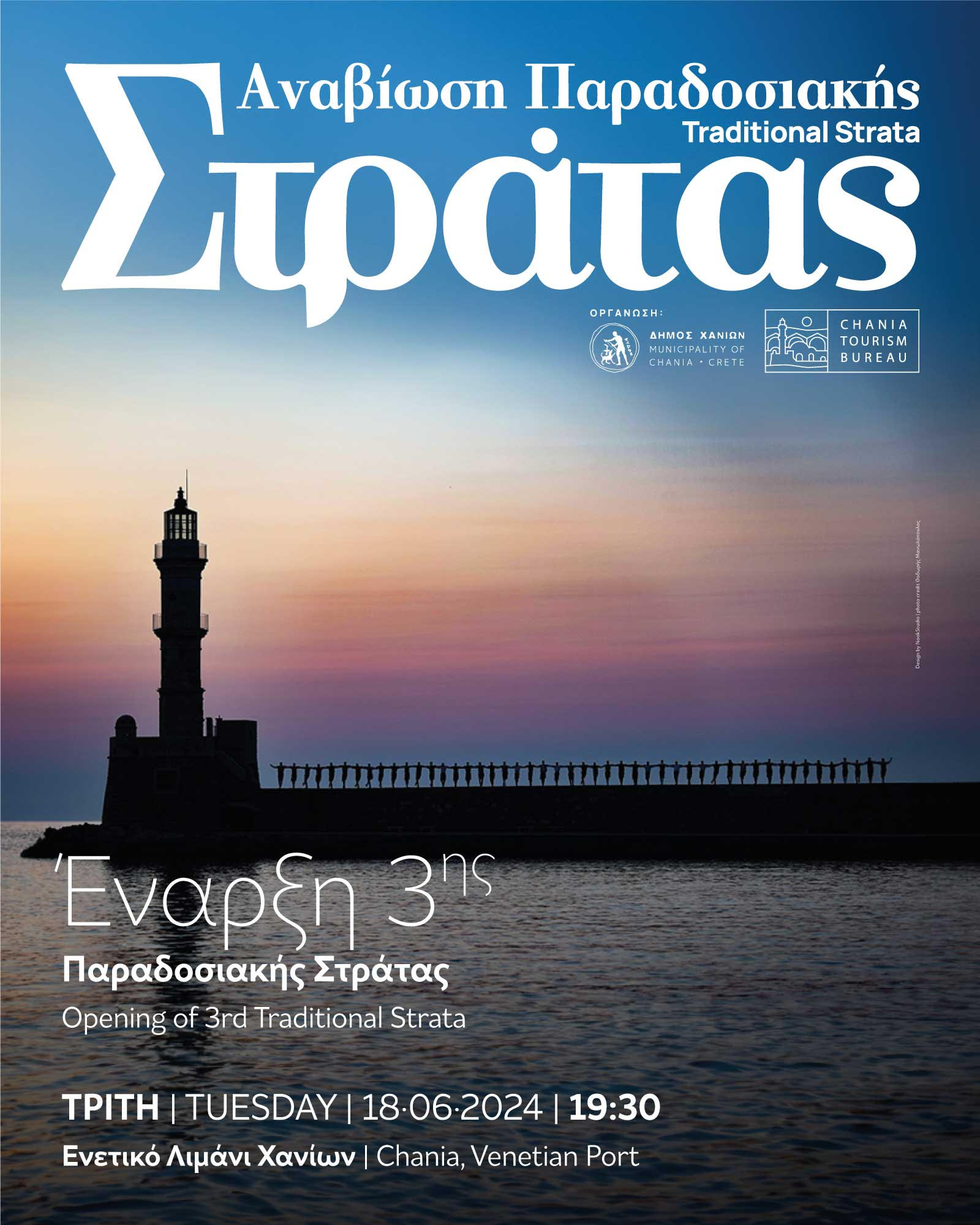 Συγκεκριμένα όπως επισήμανε ο Αντιδήμαρχος Τουρισμού, Νεκτάριος Ψαρουδάκης «η Παραδοσιακή Στράτα του Δήμου Χανίων, που έχει καθιερωθεί πλέον ως θεσμός τα καλοκαίρια μας, θα ξεκινήσει την Τρίτη στις 19:30 με τη συμμετοχή όλων των παραδοσιακών συλλόγων και σημείο εκκίνησης το Γιαλί Τζαμί. Με την ταυτόχρονη παρουσία χορευτών στον Φάρο, χορευτριών έξω από το Φρούριο Φιρκά και υπό την μελωδία ριζίτικων τραγουδιών που θα ερμηνεύσουν οι Ριζίτες, σηματοδοτούμε την έναρξη της Παραδοσιακής Στράτας».