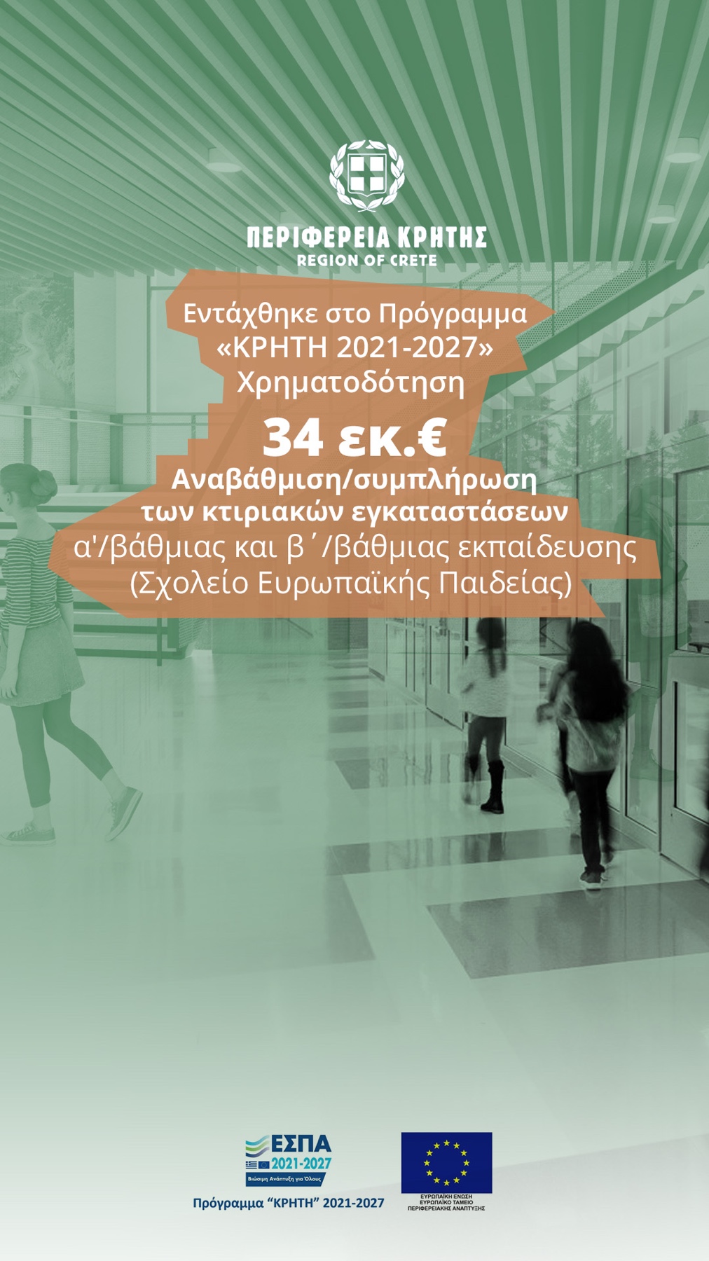 Σε μια σημαντική πρωτοβουλία για την αναβάθμιση των εκπαιδευτικών υποδομών της Κρήτης προχωρά η Περιφέρεια, με την έκδοση πρόσκλησης για την ανέγερση του νέου Σχολείου Ευρωπαϊκής Παιδείας στο Ηράκλειο. Η δημόσια δαπάνη που διατίθεται για το έργο ανέρχεται σε 34.000.000,00€ και καλύπτεται από το Πρόγραμμα «Κρήτη» 2021-2027 με τη συγχρηματοδότηση του Ευρωπαϊκού Ταμείου Περιφερειακής Ανάπτυξης (ΕΤΠΑ).