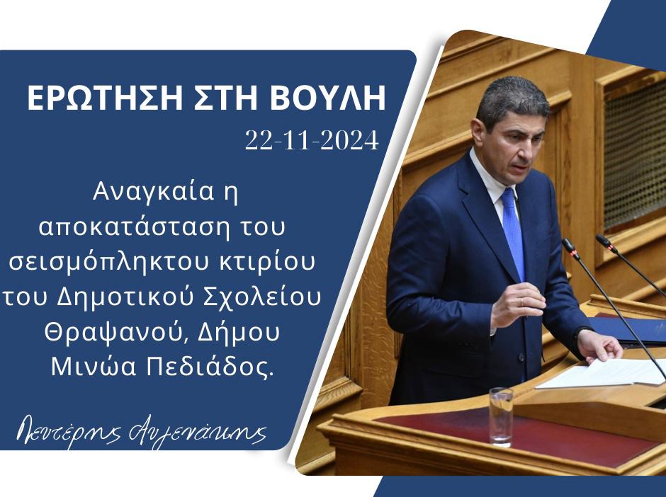 Στο πλαίσιο αυτό, ο Βουλευτής Ηρακλείου και πρώην Υπουργός Λευτέρης Αυγενάκης κατέθεσε Ερώτηση στη Βουλή προς τους Υπουργούς Παιδείας, Θρησκευμάτων και Αθλητισμού, κ. Κυριάκο Πιερρακάκη, Υποδομών και Μεταφορών, κ. Χρήστο Σταϊκούρα, Εσωτερικών, κ. Θεόδωρο Λιβάνιο, και Κλιματικής Κρίσης και Πολιτικής Προστασίας, κ. Βασίλη Κικίλια, σχετικά με την αποκατάσταση του σεισμόπληκτου κτιρίου του Δημοτικού Σχολείου Θραψανού, Δήμου Μινώα Πεδιάδος, Π.Ε. Ηρακλείου.