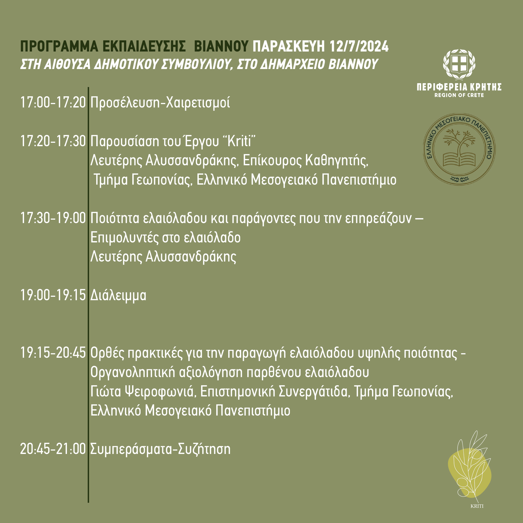Η Περιφέρεια Κρήτης και το Ελληνικό Μεσογειακό Πανεπιστήμιο, σε συνεργασία με το Δήμο Βιάννου, διοργανώνουν εσπερίδα για την ποιότητα του Εξαιρετικού Παρθένου Ελαιόλαδου “Kriti” η οποία θα πραγματοποιηθεί την Παρασκευή 12 Ιουλίου 2024, στις 17:00, στην αίθουσα δημοτικού συμβουλίου στο δημαρχείο Βιάννου.
