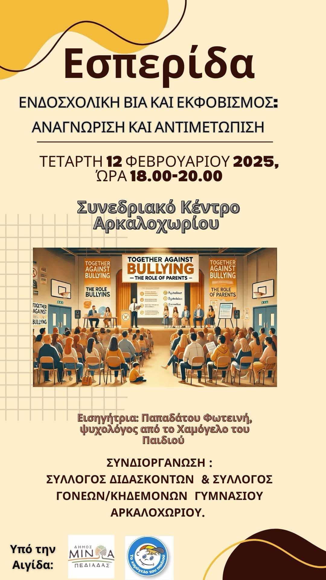 O Σύλλογος Διδασκόντων του Γυμνασίου Αρκαλοχωρίου και o Σύλλογος Γονέων και Κηδεμόνων του Γυμνασίου Αρκαλοχωρίου, υπό την Αιγίδα του Δήμου Μινώα Πεδιάδας και του Οργανισμού «Το Χαμόγελο του Παιδιού», διοργανώνουν εσπερίδα με θέμα: “Ενδοσχολική Βία και Εκφοβισμός: Αναγνώριση και Αντιμετώπιση”, την Τετάρτη 12/02/2025 από τις 18.00-20.00 στο Εκθεσιακό Κέντρο Αρκαλοχωρίου.