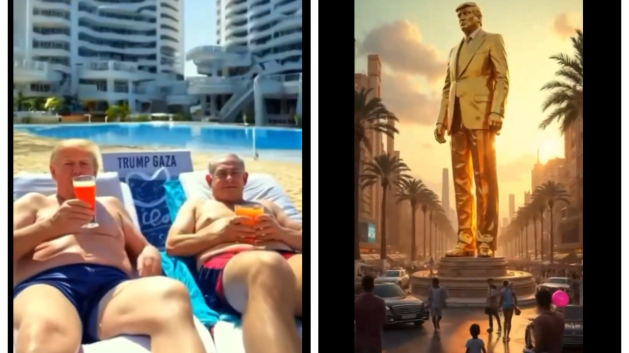 Επιπλέον, βλέπουμε το πρόσωπό του σε ένα μπαλόνι που κρατάει ένα παιδί, ένα τεράστιο άγαλμα που έχει στηθεί προς τιμήν του, ένα κτίριο με το όνομα «Trump Gaza» αλλά και με τον Μπενιαμίν Νετανιάχου οι δυο τους να χαλαρώνουν τόπλες δίπλα στην πισίνα απολαμβάνοντας τα κοκτέιλ τους και κάνοντας ηλιοθεραπεία.