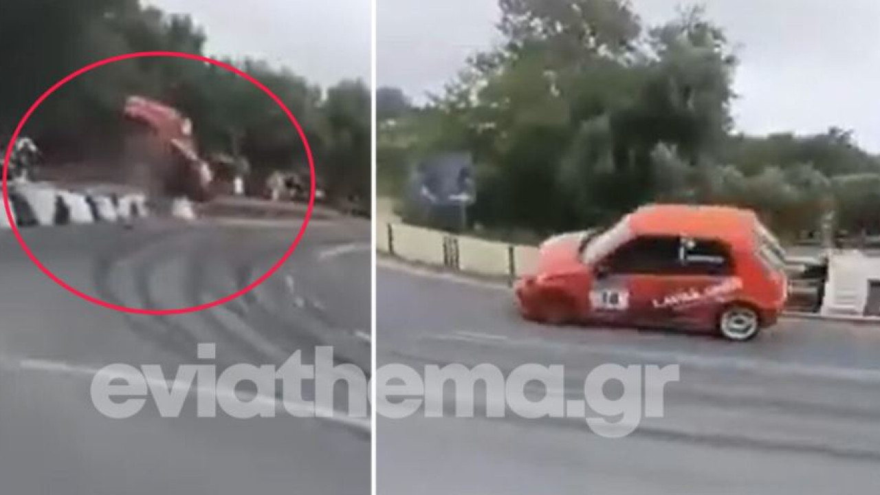 Ένα αγωνιστικό όχημα κατά τη διάρκεια της πορείας του μετά από στροφή ανατρέπεται με σφοδρότητα πάνω στα προστατευτικά και καταλήγει στη μέση περίπου του δρόμου.