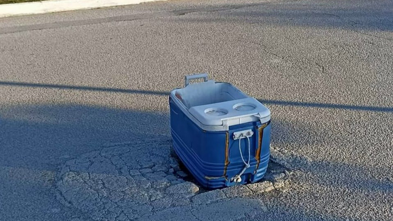 Χαρακτηριστικά είναι τα στιγμιότυπα από το Πευκί που δημοσίευσε το Ιστιαία News, μεγάλη λακούβα στον δρόμο καλύφθηκε «όπως- όπως» με ένα… φορητό ψυγείο που τοποθετήθηκε στο σημείο.