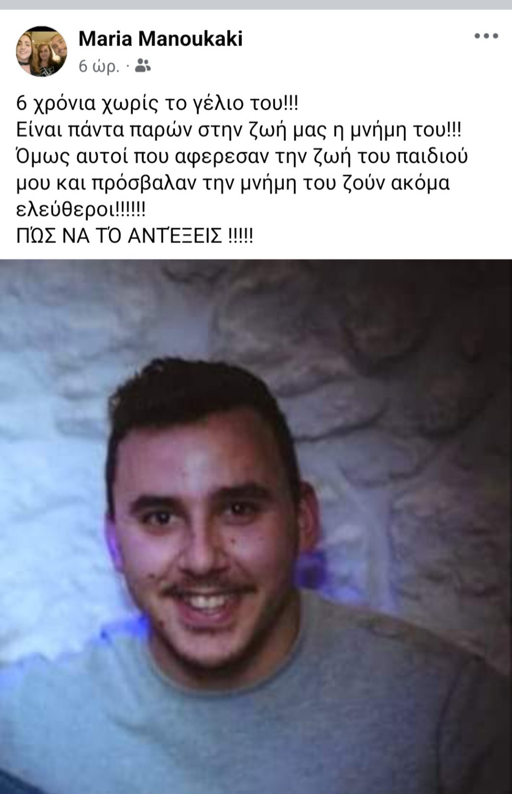 Στην ανάρτησή της αναφέρει: «Έξι χρόνια χωρίς το γέλιο του!!!Είναι πάντα παρών στη ζωή μας η μνήμη του! Όμως αυτοί που αφαίρεσαν τη ζωή του παιδιού μου και προσβάλλουν τη μνήμη του ζουν ακόμα ελεύθεροι!!! Πώς να το αντέξεις!!!!»