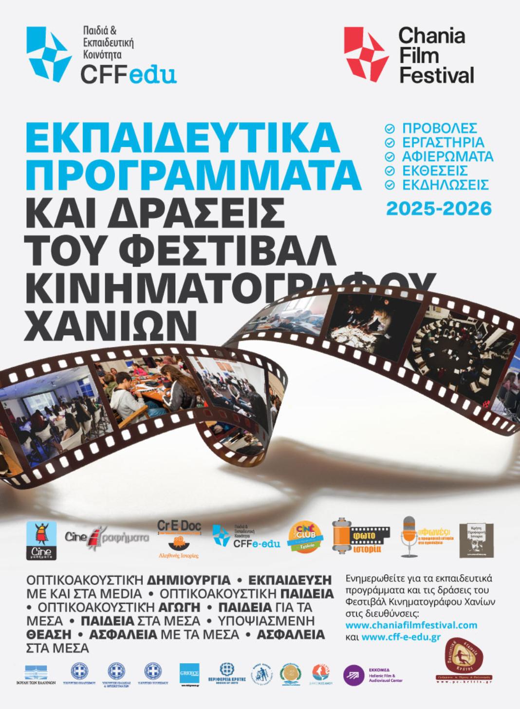 Το Φεστιβάλ Κινηματογράφου Χανίων, για ακόμη μία σχολική χρονιά, σχεδιάζει, υλοποιεί και προσφέρει ετήσια Επιμορφωτικά και Εκπαιδευτικά Προγράμματα (δια ζώσης και εξ αποστάσεως) στην εκπαιδευτική κοινότητα και καλεί όσους/όσες ενδιαφέρονται να συμμετέχουν σ’ αυτά.