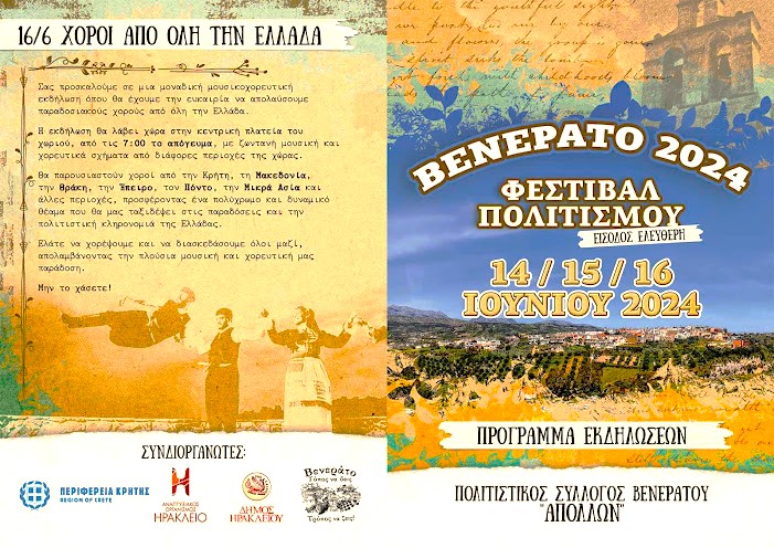Ένα μοναδικό Φεστιβάλ Πολιτισμού πρόκειται να πραγματοποιηθεί στο Βενεράτο του Δήμου Ηρακλείου από την Παρασκευή 14/6 έως Κυριακή 16/6.Το Φεστιβάλ το διοργανώνει ο Πολιτιστικός Σύλλογος Βενεράτου Απόλλων με συνδιοργανωτές την Περιφέρεια Κρήτης και τον Αναπτυξιακό Οργανισμό Ηράκλειο του Δήμου Ηρακλείου, συμπεριλαμβάνει μαγειρέματα, ξενάγηση στο ιστορικό μοναστήρι της Παλιανής, στα Μινωικά πατητήρια, γευσιγνωσία κρασιών από τα οινοποιία της περιοχή μας, αλλά και παραδοσιακούς χορούς και τραγούδια .Όλες οι δράσεις θα πραγματοποιηθούν στις όμορφες πλατείες του χωριού που βρίσκεται περίπου σε απόσταση 20 χιλιομέτρων από την πόλη του Ηρακλείου.