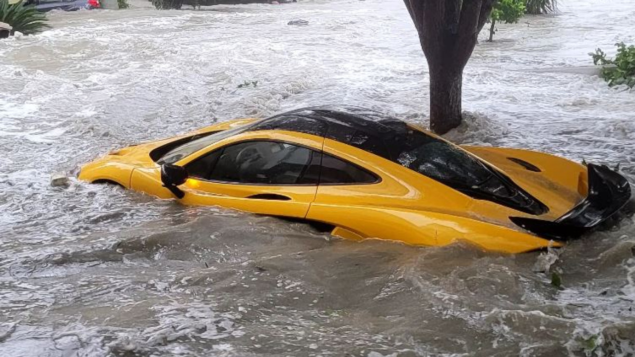 Πρόκειται για το μοντέλο McLaren P1. Βρισκόταν στο γκαράζ του άτυχου ιδιοκτήτη μαζί με μια Rolls Royce και λόγω της πλημμύρας μετακινήθηκε προς τα έξω.