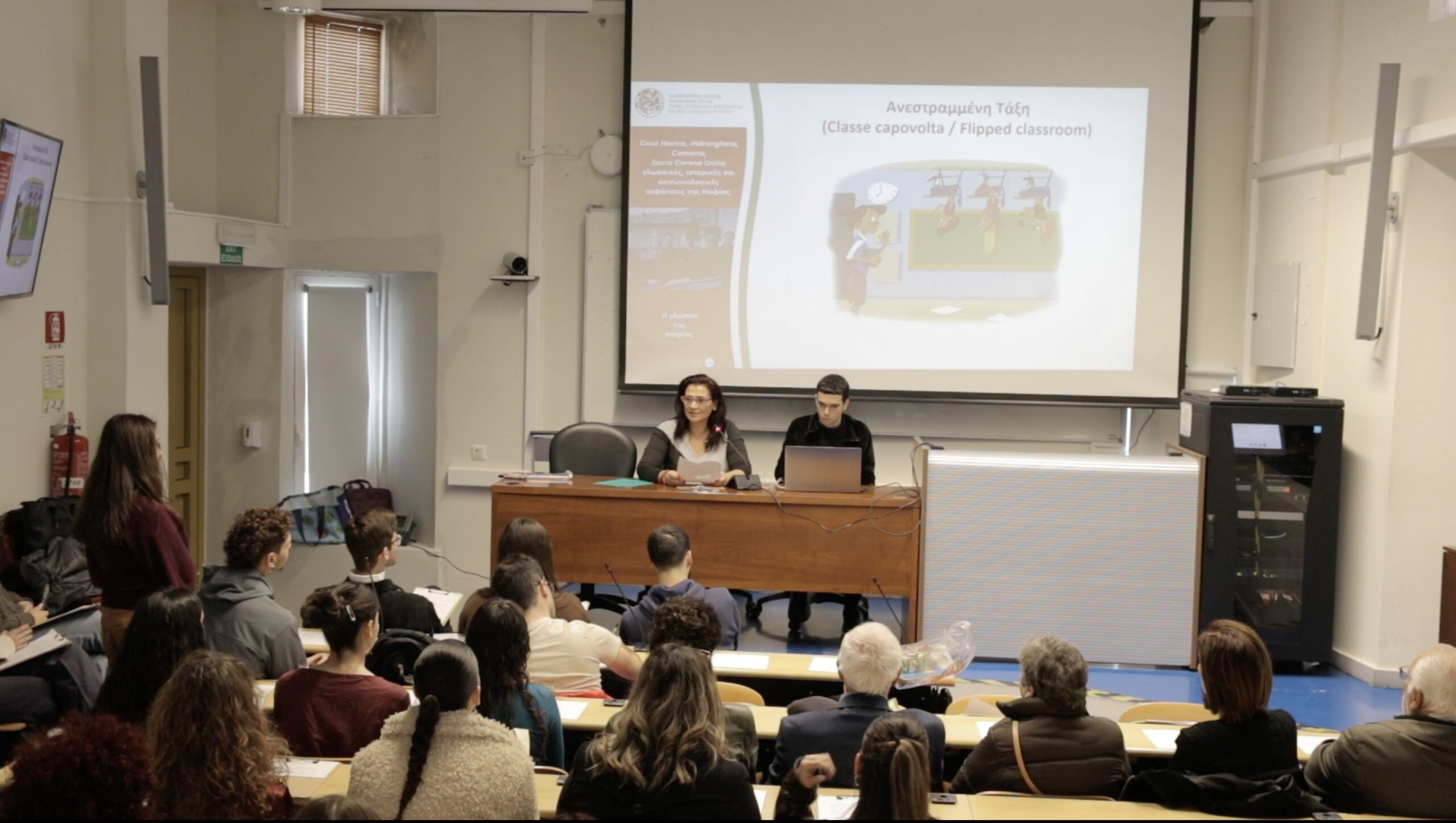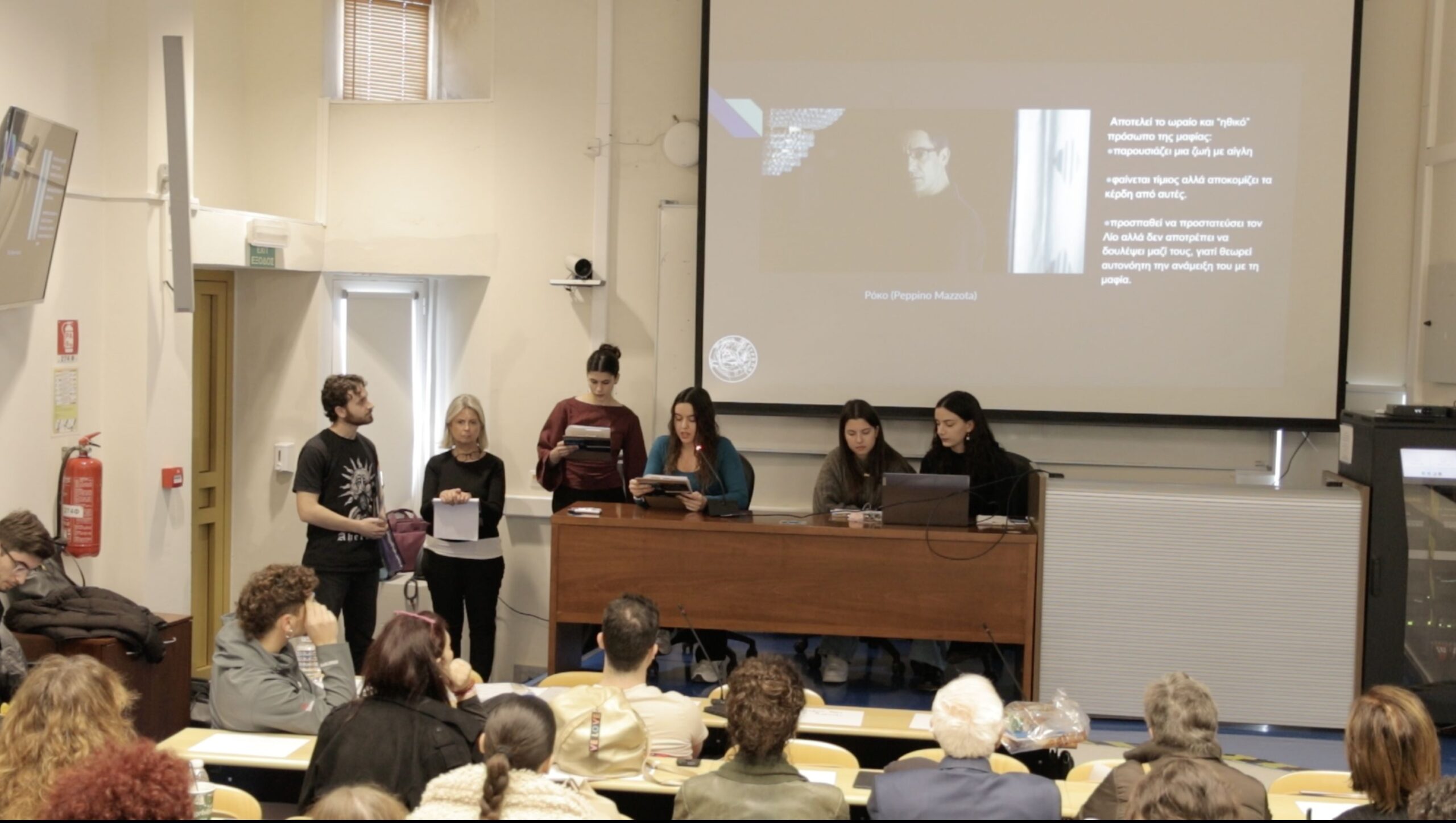 Ιδιαίτερη αυθεντικότητα στη δράση προσέδωσε η παρουσία δύο Ιταλίδων προσκεκλημένων: της κας Κατερίνας Micelli Μασέλη, από το Αγκριτζέντο της Σικελίας, και της κας Carmella Pietrosanto Καλικάκη, από τη Ρώμη. Μετά τις παρουσιάσεις των ομάδων εργασίας, ακολούθησε ζωντανή συζήτηση, κατά την οποία μοιράστηκαν προσωπικές εμπειρίες και προβληματισμούς σχετικά με την αντίληψη της Μαφίας στην καθημερινότητα, προσφέροντας στους φοιτητές και τις φοιτήτριες μια αυθεντική βιωματική οπτική και ενισχύοντας τον διαπολιτισμικό διάλογο και την κριτική σκέψη.