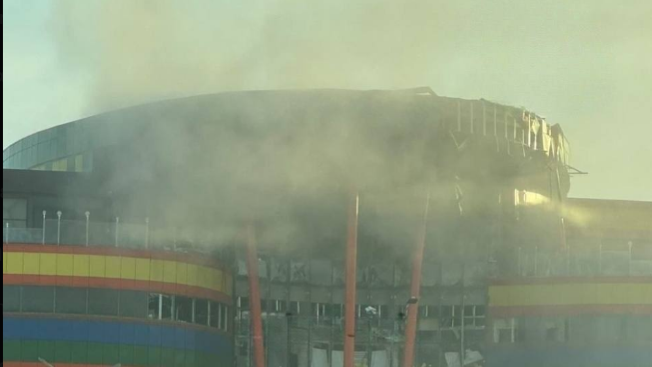 Οπτικό υλικό που μεταδόθηκε από ρωσικά ΜΜΕ εικονίζει πυκνό λευκό καπνό να αναδίδεται από το τετραώροφο εμπορικό κέντρο.