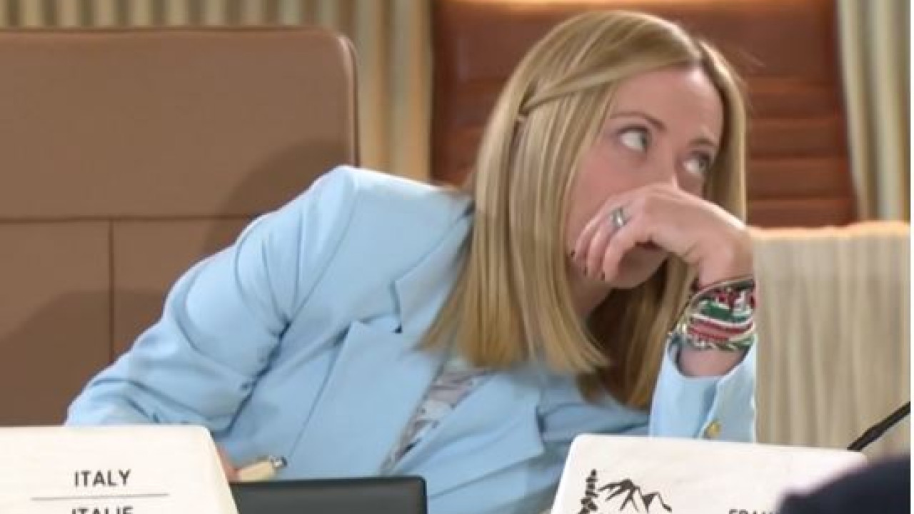 Την απίστευτη γκριμάτσα της Ιταλίδας πρωθυπουργού, Τζόρτζια Μελόνι ενώ της ψιθύριζε κάτι στο αφτί ο Γάλλος πρόεδρος Εμανουέλ Μακρόν ενώ καθόταν στη στρογγυλή τράπεζα της G7, έπιασε ο φωτογραφικός φακός.
