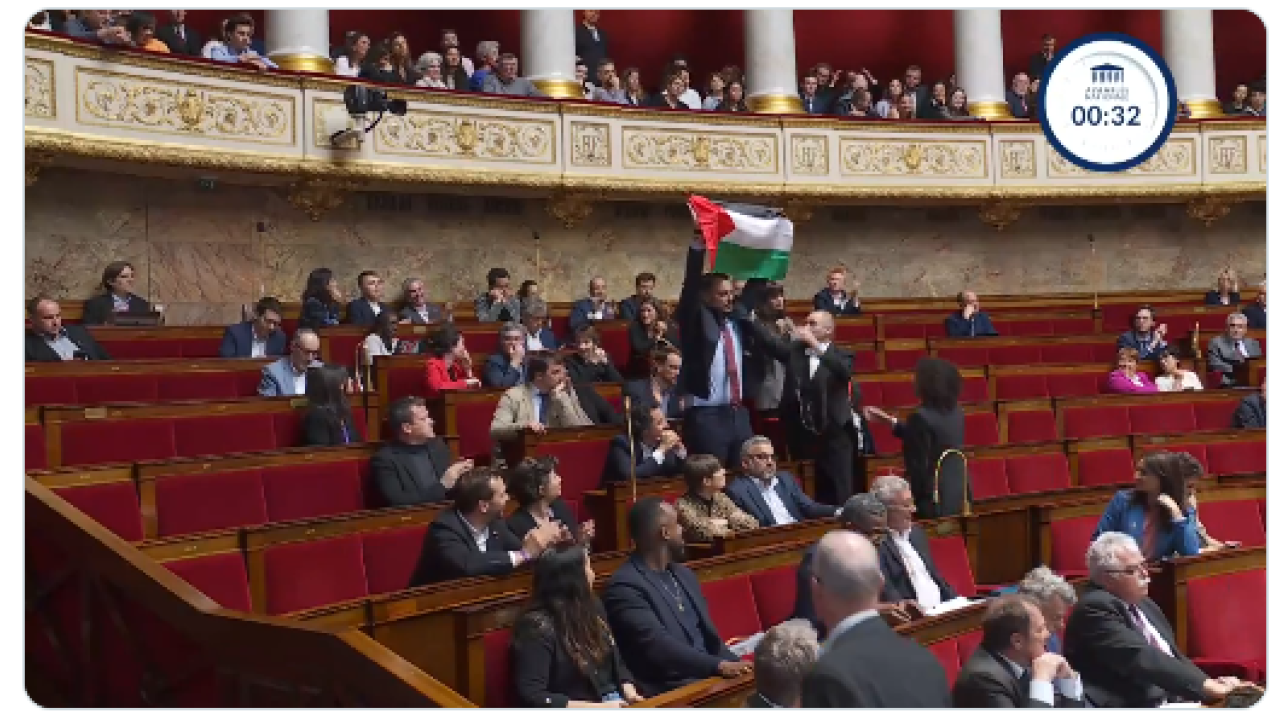 Ο βουλευτής σήκωσε τη σημαία της Παλαιστίνης ενώ ο υπουργός Εξωτερικού Εμπορίου Franck Riester απαντούσε σε ερώτηση σχετικά με τον πόλεμο στη Γάζα.