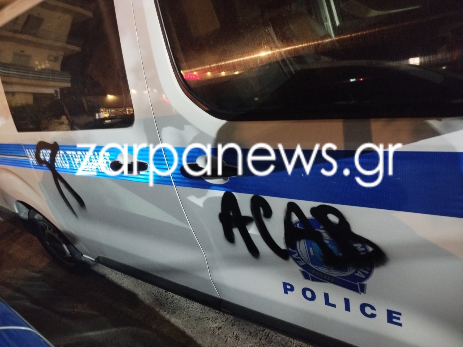 Συνθήματα κατά των αστυνομικών έγραψαν άγνωστοι στα περιπολικά και τις κλούβες έξω από το αστυνομικό Μέγαρο Χανίων, το βράδυ του Σαββάτου, όπως φαίνεται στις φωτογραφίες.