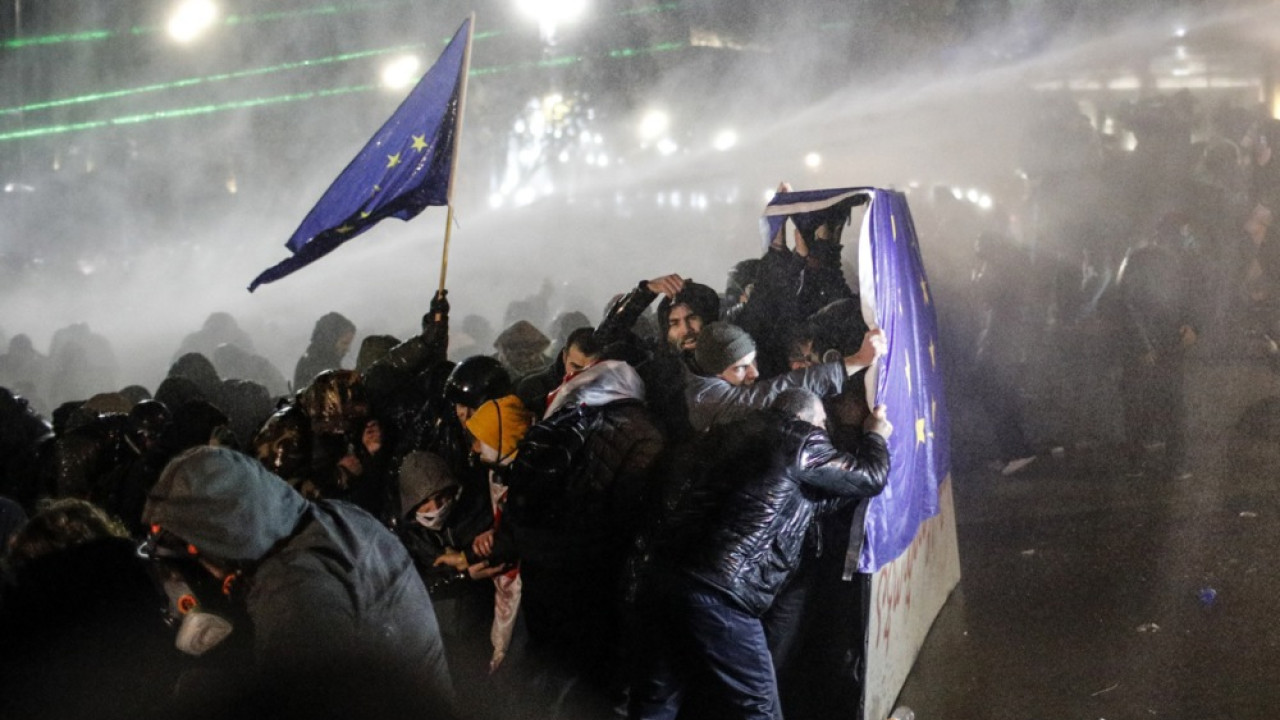 Άγρια επεισόδια σημειώθηκαν το βράδυ της Πέμπτης στην Τιφλίδα. Χιλιάδες διαδηλωτές κατέκλυσαν τους δρόμους γύρω από τη γεωργιανή Βουλή για να εκφράσουν την αντίθεσή τους στην απόφαση του κυβερνώντος κόμματος να αναστείλει τις ενταξιακές συνομιλίες με την ΕΕ για τέσσερα χρόνια, με τις αστυνομικές δυνάμεις να απαντούν με αύρες και δακρυγόνα. Σαράντα τρία άτομα συνελήφθησαν και 32 αστυνομικοί τραυματίστηκαν, δεν υπάρχει αναφορά για τραυματισμούς διαδηλωτών.