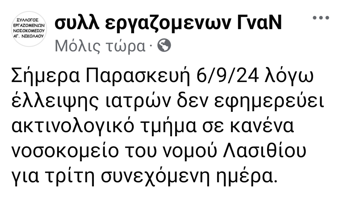 Σύμφωνα με σχετική ανακοίνωση του Συλλόγου Εργαζομένων του Νοσοκομείου Αγίου Νικολάου: «Σήμερα Παρασκευή 6/9/24 λόγω έλλειψης ιατρών δεν εφημερεύει ακτινολογικό τμήμα σε κανένα νοσοκομείο του νομού Λασιθίου για τρίτη συνεχόμενη ημέρα».