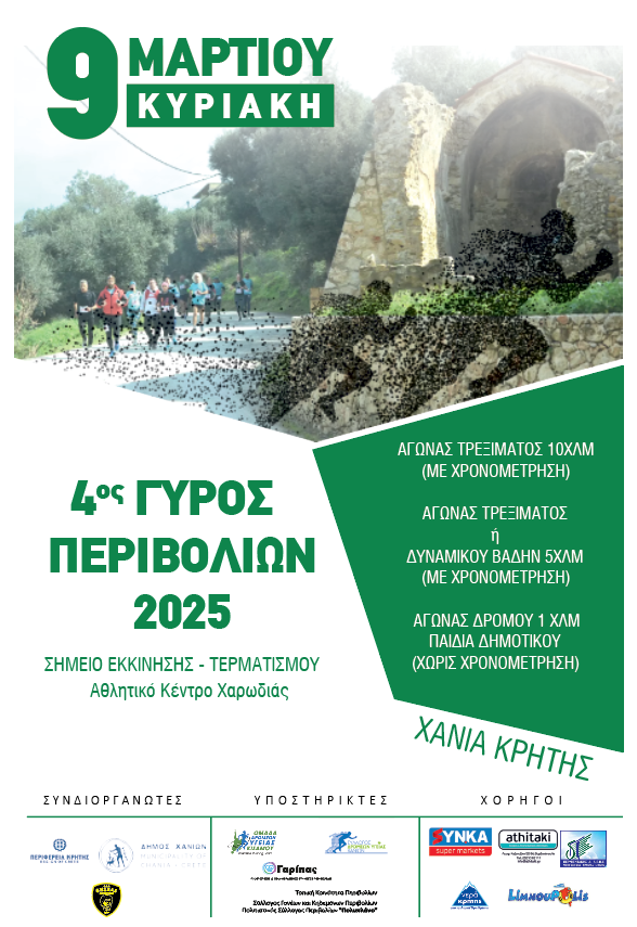 Την Κυριακή 9 Μαρτίου, στις 10.30, θα πραγματοποιηθεί ο 4ος «ΓΥΡΟΣ ΠΕΡΙΒΟΛΙΩΝ 2025», με αφετηρία και τερματισμό το Αθλητικό Κέντρο Χαρωδιάς, όπως ανακοινώθηκε σε Συνέντευξη Τύπου, που παραχωρήθηκε σήμερα, Τετάρτη 26 Φεβρουαρίου στην Αίθουσα Δημοτικού Συμβουλίου του Δημαρχείου Χανίων.