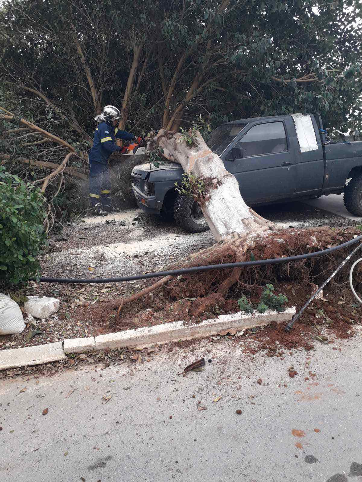 Το μεγάλο δέντρο, που βρισκόταν σε ιδιωτικό χώρο, έπεσε πάνω σε σταθμευμένο αυτοκίνητο, χωρίς ευτυχώς να προκληθούν τραυματισμοί.