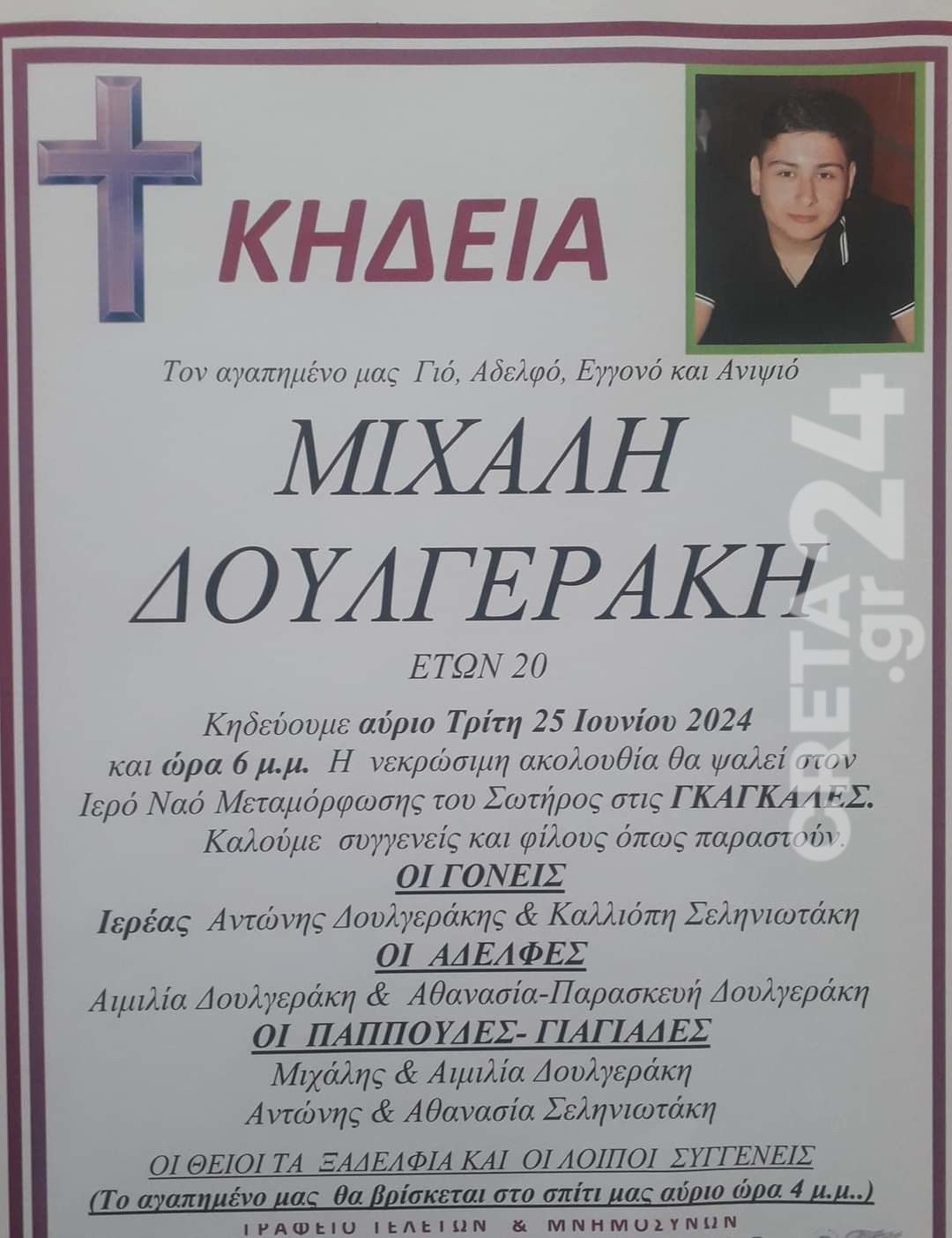 Συγγενείς και φίλοι θα πουν αύριο, Tρίτη, το τελευταίο αντίο στον 20χρονο Μιχάλη.
