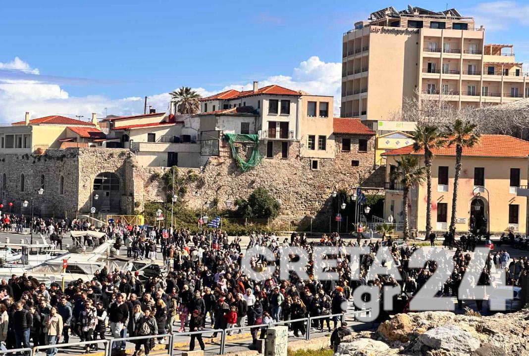 Χιλιάδες Ηρακλειώτες βγήκαν στους δρόμους για την επέτειο των δύο χρόνων από την σιδηροδρομική τραγωδία των Τεμπών, με καθολικό αίτημα την απονομή δικαιοσύνης για τους 57 νεκρούς.