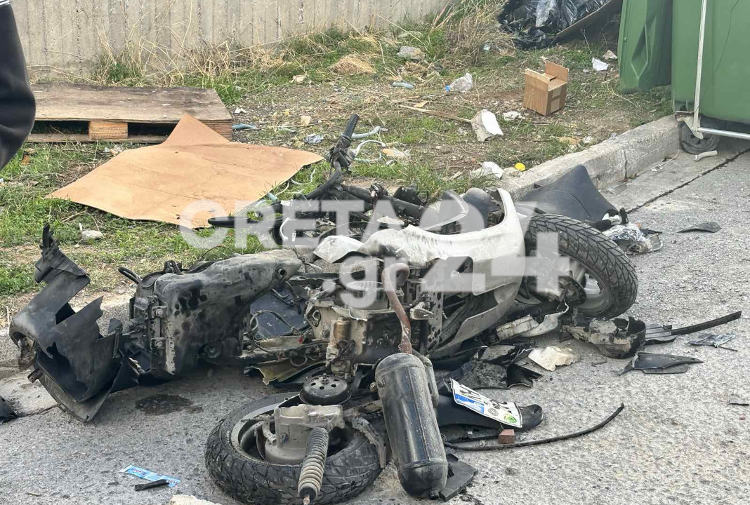 Όπως φαίνεται και στις εικόνες του Creta24, η σύγκρουση ήταν σφοδρή με το δίκυκλο να έχει σχεδόν διαλυθεί και το λευκό ΙΧ να έχει υποστεί σημαντικές ζημιές.