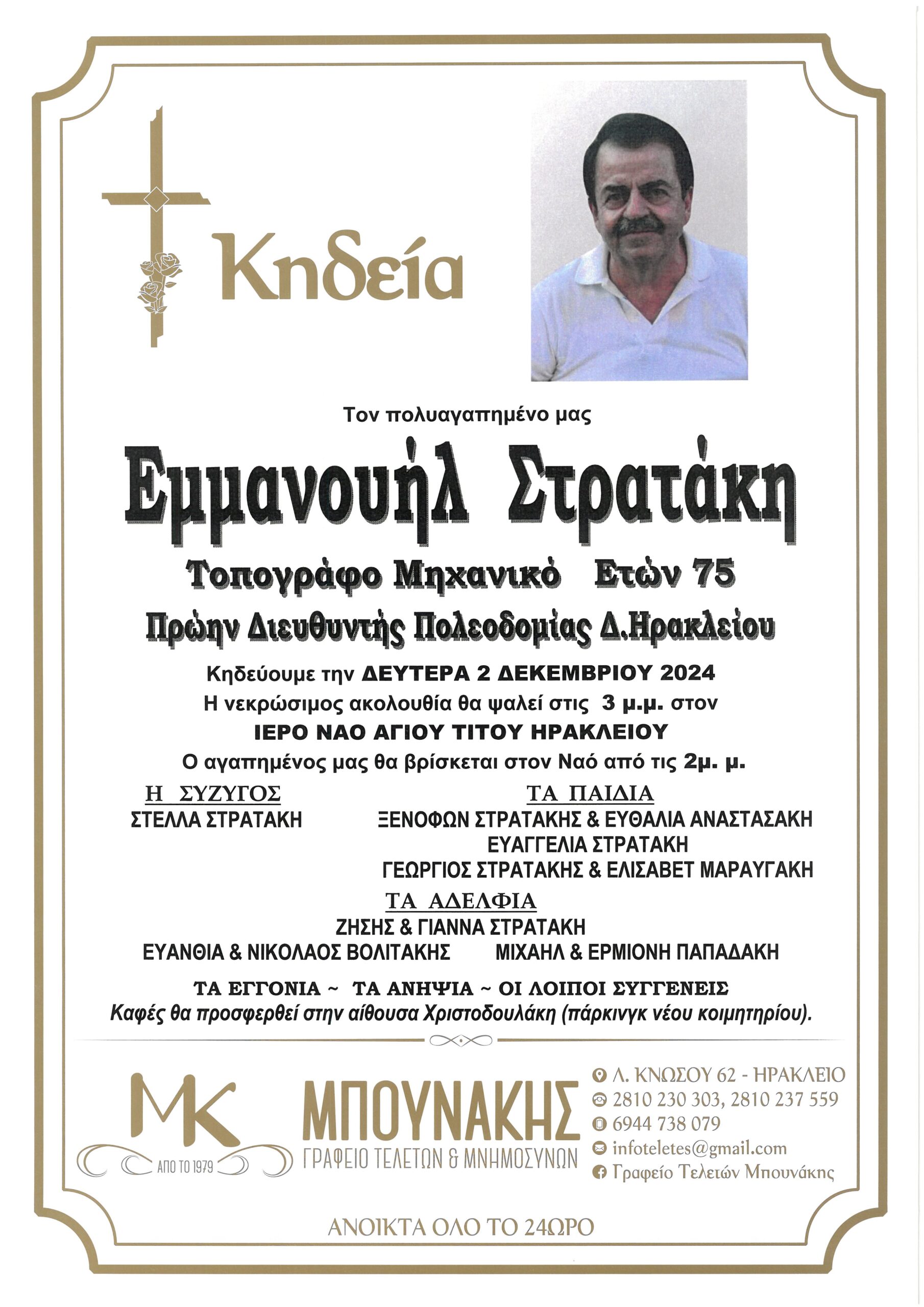 Η κηδεία του θα γίνει σήμερα Δευτέρα, 2 Δεκεμβρίου στις 3 το μεσημέρι στον Ιερό Ναό του Αγίου Τίτου.