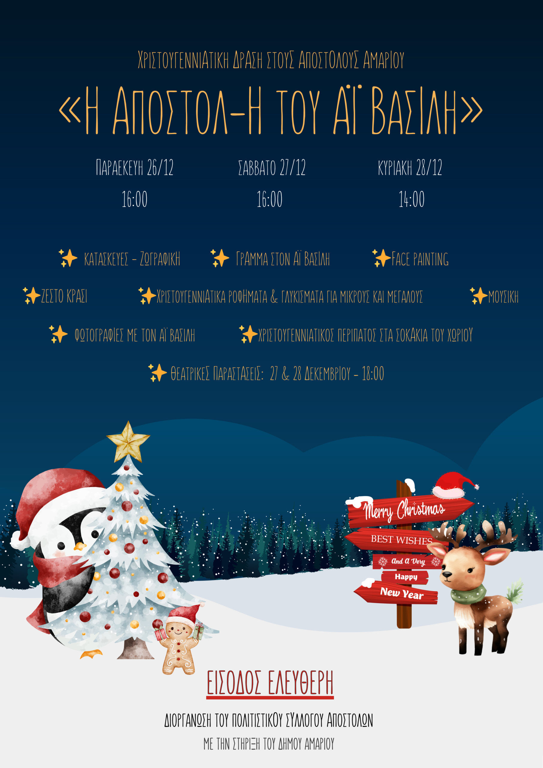 Ο Πολιτιστικός Σύλλογος Αποστόλων διοργανώνει μια τριήμερη χριστουγεννιάτικη δράση για παιδιά και οικογένειες, με τίτλο «Η Αποστολ-ή του Άι Βασίλη», η οποία θα πραγματοποιηθεί στις 26, 27 και 28 Δεκεμβρίου στο χωριό των Αποστόλων.