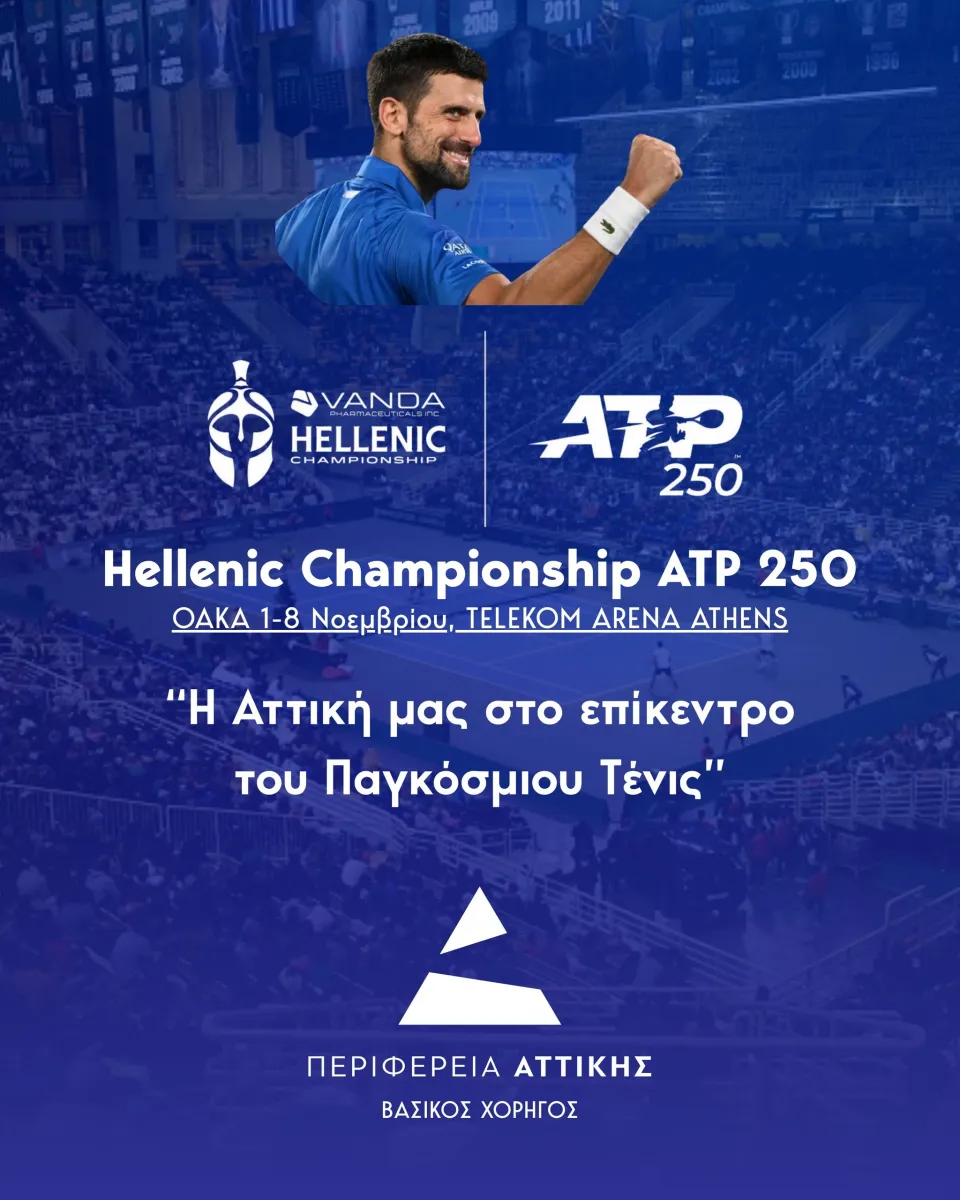 Η Περιφέρεια Αττικής αποτελεί βασικό χορηγό της διοργάνωσης “Vanda Pharmaceuticals Hellenic Championship ATP 250” που θα διεξαχθεί από την 1η έως τις 8 Νοεμβρίου στην Αθήνα.