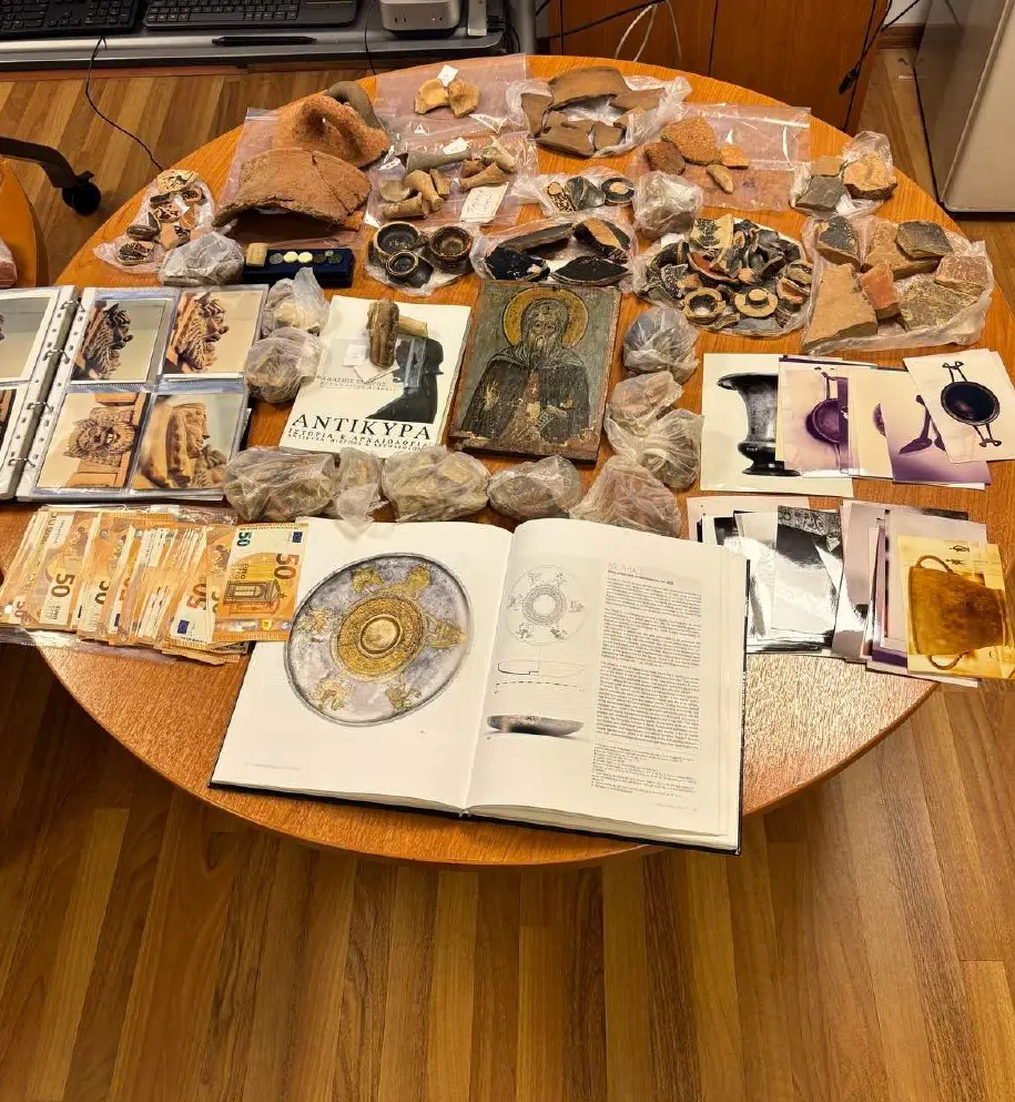 Σε ταυτόχρονες έρευνες που πραγματοποιήθηκαν σε οικίες στο κέντρο της Αθήνας, στη Σαρωνίδα Αττικής, στη Μαλεσίνα Φθιώτιδας και σε περιοχή της Χαλκιδικής, παρουσία δικαστικών λειτουργών, αρχαιολόγων και κλιμακίου της Διεύθυνσης Εγκληματολογικών Ερευνών, βρέθηκαν σε οικία του κατηγορουμένου και κατασχέθηκαν: