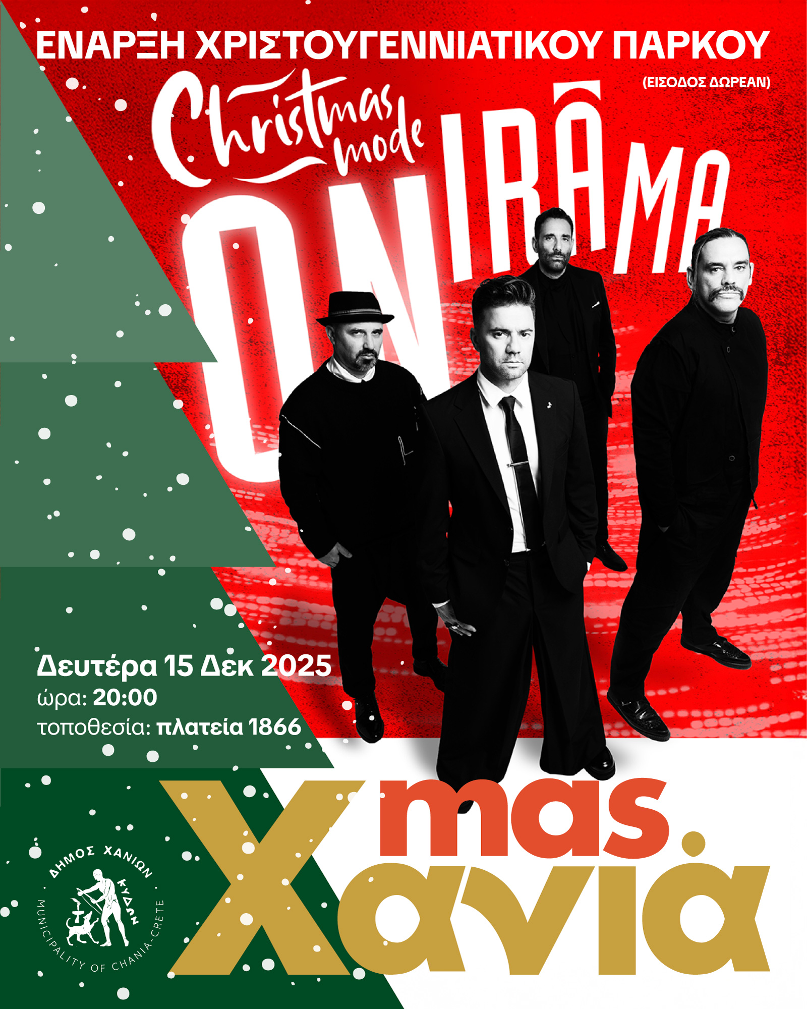 Με μια εντυπωσιακή συναυλία από το δημοφιλές συγκρότημα ONIRAMA, σε μια ατμόσφαιρα γεμάτη χριστουγεννιάτικη μαγεία, γλυκίσματα και αρωματικά ροφήματα, ανοίγει τις πύλες του το Χριστουγεννιάτικο Πάρκο του Δήμου Χανίων στην πλατεία 1866 στα Χανιά, τη Δευτέρα 15 Δεκεμβρίου 2025.
