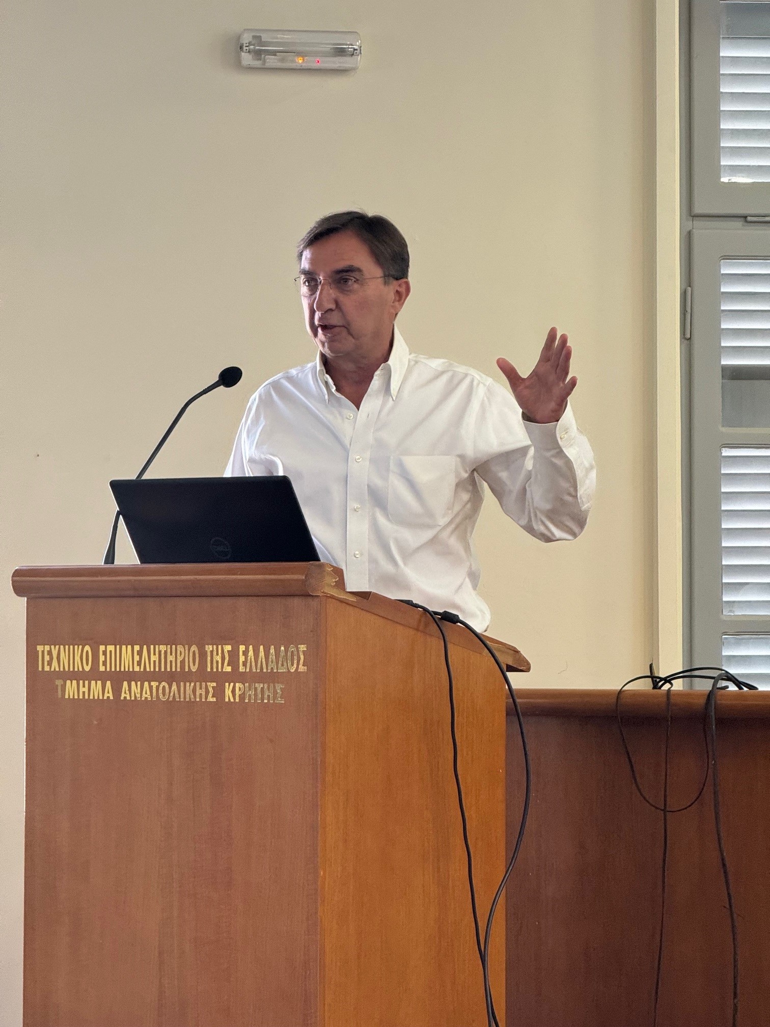 Πιο αναλυτικά στην παρουσίαση του ανέπτυξε το θέμα : «Η Κρήτη στο Επίκεντρο της Βιώσιμης Ανάπτυξης» και τις Προτεραιότητες ESG για τις Υποδομές της Κρήτης, ανέφερε ότι το Νέο Αεροδρόμιο Καστελλίου ως ένα Πρότυπο ESG. Στη συνέχεια αναφέρθηκε στις δυνατότητες Χρηματοδότησης ESG Έργων στην Κρήτη και μια πρόταση για αξιοποίηση του Υπερταμείου στην ESG Ανάπτυξη της Κρήτης. Όμως για να γίνουν όλα αυτά απαιτείται Εκπαίδευση και Ανάπτυξη Δεξιοτήτων ESG και υπέβαλε ιδέες και προτάσεις. Ανέφερε παραδείγματα για τον Ψηφιακό Μετασχηματισμό και τον Βιώσιμο Τουρισμό, ως τις νέες προκλήσεις για την Κρήτη μέσα από τα ESG. Κυκλική Οικονομία: Από τη Θεωρία στην Πράξη. Πως αντιμετωπίζεται η Προσαρμογή στην Κλιματική Αλλαγή με Ανθεκτικές Υποδομές στην Κρήτη και πως θα γίνει πράξη η Ενεργειακή Αυτονομία της Κρήτης και οι Βιώσιμες Μεταφορές στο νησί.