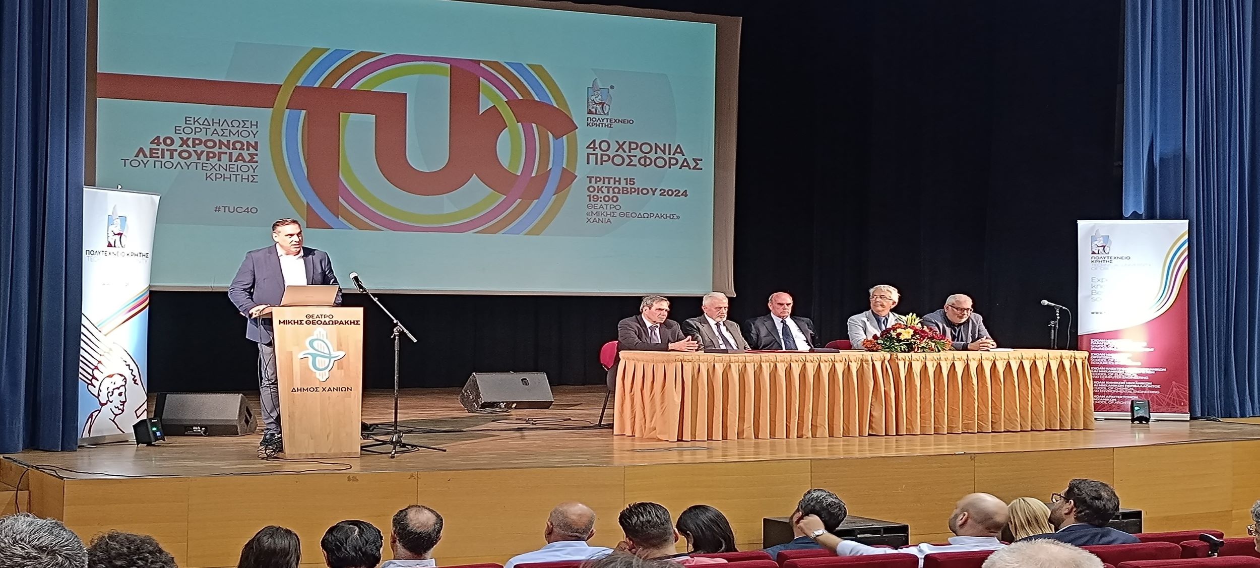 Στην τελετή για τα 40 χρόνια από την έναρξη λειτουργίας του Πολυτεχνείου Κρήτης, που πραγματοποιήθηκε στο Θέατρο «Μίκης Θεοδωράκης», στα Χανιά, συμμετείχε η Περιφέρεια Κρήτης, τιμώντας την πολυετή προσφορά του ιδρύματος στην τοπική κοινωνία.