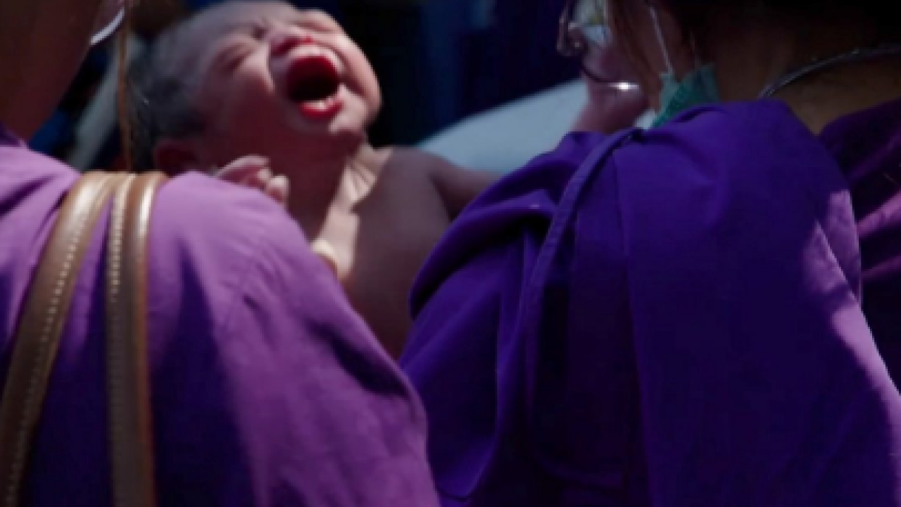 Η γυναίκα, η οποία είχε μεταφερθεί εκτός του νοσοκομείου λόγω προληπτικών μέτρων ασφαλείας, βρισκόταν σε φορείο όταν ξεκίνησε ο τοκετός. Το ιατρικό προσωπικό περικύκλωσε τη μητέρα και τη βοήθησε να γεννήσει το μωρό της.