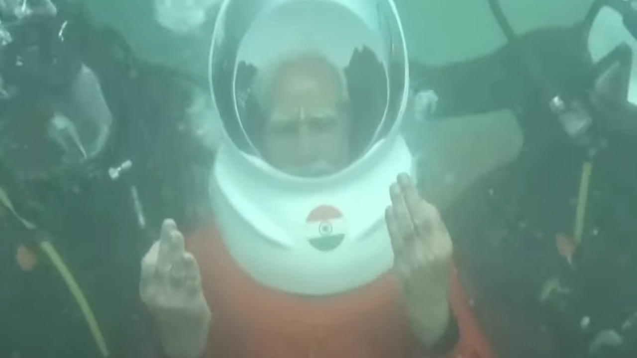 Ο πρωθυπουργός της Ινδίας φορώντας την παραδοσιακή ριχτή πορτοκαλί ενδυμασία των Ινδουϊστών και ειδικό σκάφανδρο βούτηξε στα νερά της παραλίας Παντσκού στο κρατίδιο Γκουτζαράτ της ιδιαίτερης πατρίδας του στην Ινδία συνοδευόμενος από δύτες του Πολεμικού Ναυτικού της Ινδίας.