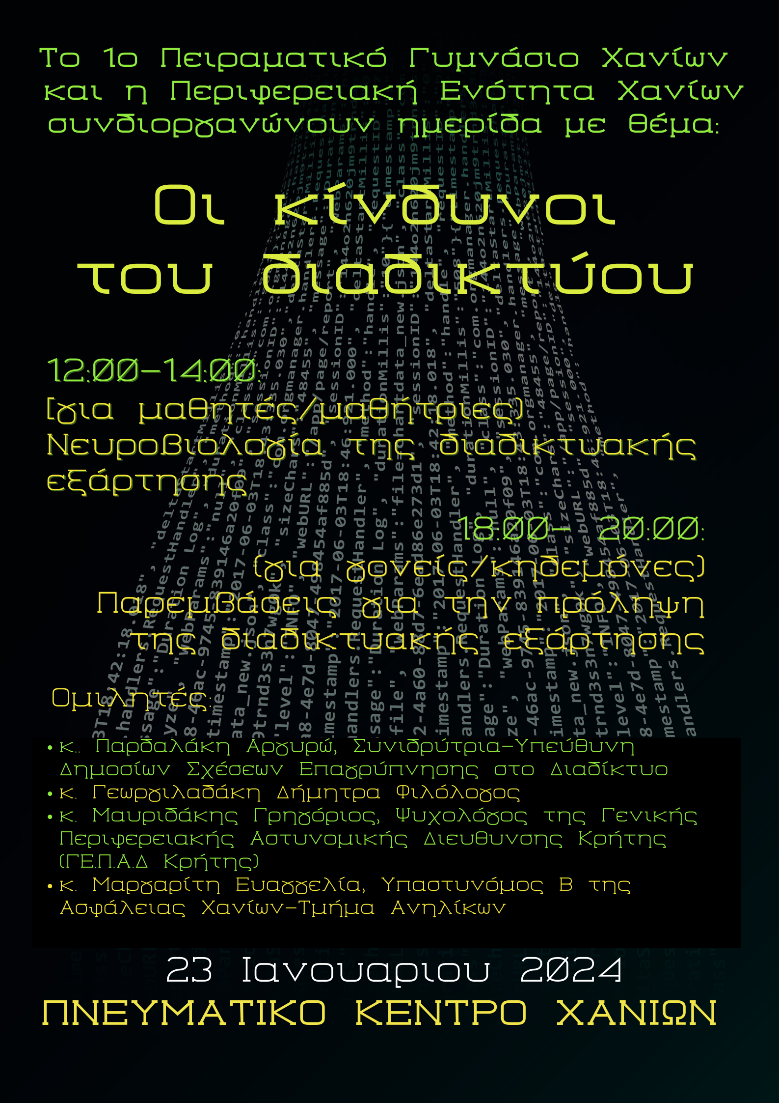 Το άρθρο “Ημερίδα με θέμα «Οι κίνδυνοι του διαδικτύου» από το 1o Πειραματικό Γυμνάσιο Χανίων“, δημοσιεύθηκε για πρώτη φορά στο CRETA24.