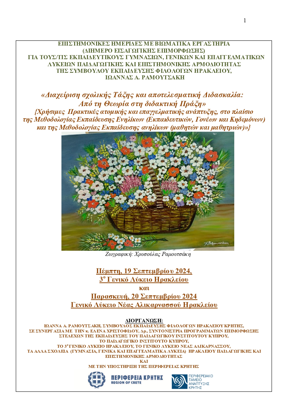 Από αύριο, Πέμπτη, 19 Σεπτεμβρίου 2024 ξεκινάει στο 3ο Γενικό Λύκειο Ηρακλείου (Δημοκρατίας 12) η Διήμερη Επιμόρφωση (Δύο Ημερίδες με εννέα (9) Βιωματικά Εργαστήρια) για τους/τις εκπαιδευτικούς και για τους Γονείς και Κηδεμόνες των Σχολείων (Γυμνάσιων, Γενικών και Επαγγελματικών Λυκείων) παιδαγωγικής και επιστημονικής αρμοδιότητας της Συμβούλου Εκπαίδευσης Φιλολόγων Ηρακλείου Κρήτης, Ιωάννας Α. Ραμουτσάκη.