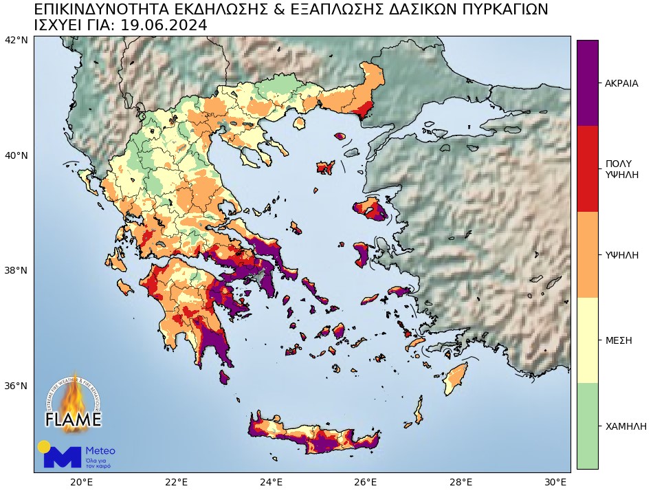– Πολύ υψηλό δυναμικό ώστε τυχόν δασικές πυρκαγιές που εκδηλωθούν να είναι καθοδηγούμενες από τον άνεμο με δυνητικά μεγάλα θερμικά φορτία αναμένεται σε Αττική, Βοιωτία (τοπικά), Κ. και Ν. Εύβοια, Λακωνία, Χίο, Σάμο και Ν. Κρήτη.