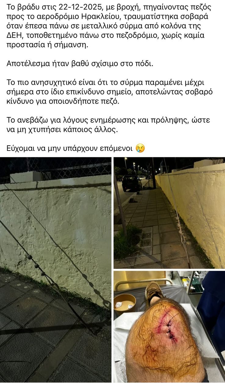 «Το βράδυ στις 22-12-2025, με βροχή, πηγαίνοντας πεζός προς το αεροδρόμιο Ηρακλείου, τραυματίστηκα σοβαρά όταν έπεσα πάνω σε μεταλλικό σύρμα από κολόνα της ΔΕΗ, τοποθετημένο πάνω στο πεζοδρόμιο, χωρίς καμία προστασία ή σήμανση.