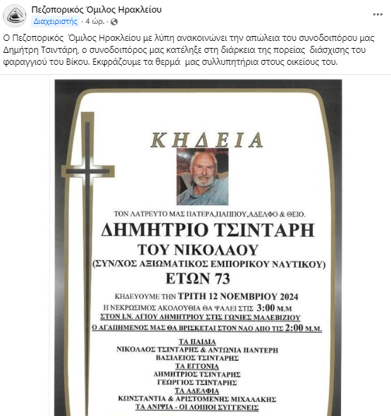 Τα θερμά του συλλυπητήρια για την απώλεια του Δημήτρη Τσιντάρη εξέφρασε ο Πεζοπορικός Όμιλος Ηρακλείου: