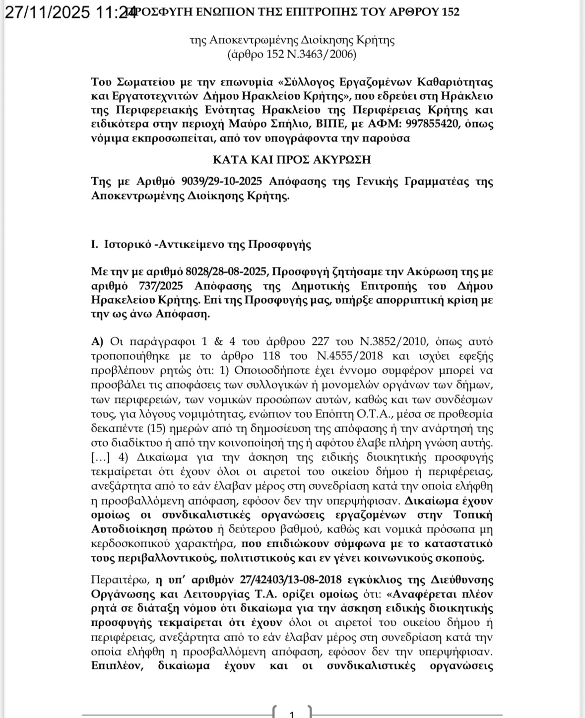 Σε πρώτη φάση, η διοίκηση του Συλλόγου των Εργαζομένων προσφεύγει στην επιτροπή του άρθρου 152 και ζητά την ανατροπή της απόφασης της Αποκεντρωμένης Διοίκησης Κρήτης, η οποία είχε απορρίψει την προσφυγή τους κατά του πολυσυζητημένου διεθνή διαγωνισμού που θα αλλάξει το σύστημα της αποκομιδής με την είσοδο εξωτερικού συνεργάτη.