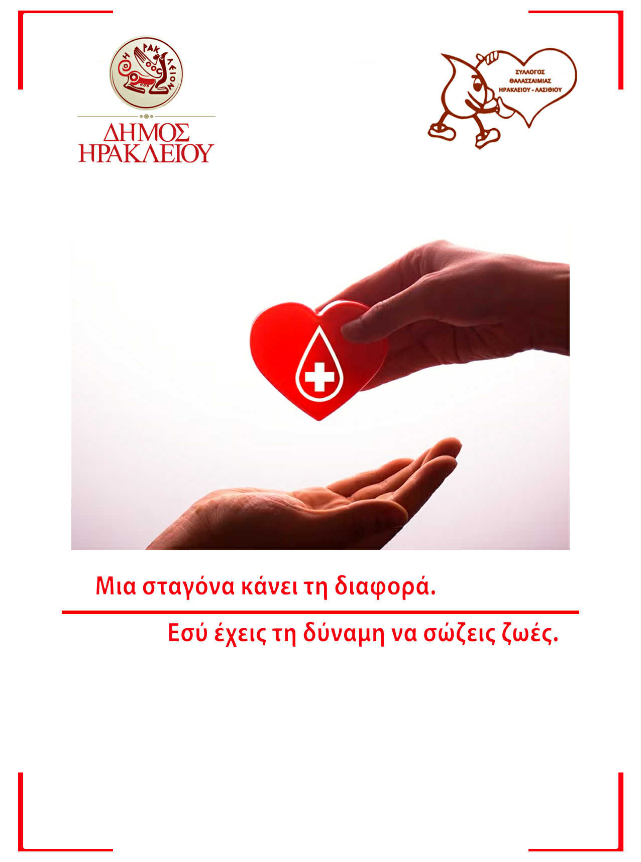 Ο Σύλλογος Θαλασσαιμίας Ηρακλείου – Λασιθίου, σε συνεργασία με τον Δήμο Ηρακλείου και τον Αντιδήμαρχο Κοινωνικής Μέριμνας κ. Γεώργιο Τσαγκαράκη, υλοποιεί δράσεις ενημέρωσης και ευαισθητοποίησης για την προώθηση της εθελοντικής αιμοδοσίας.