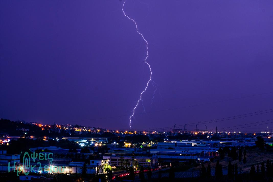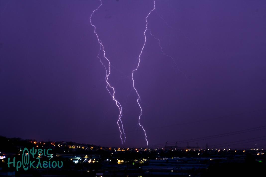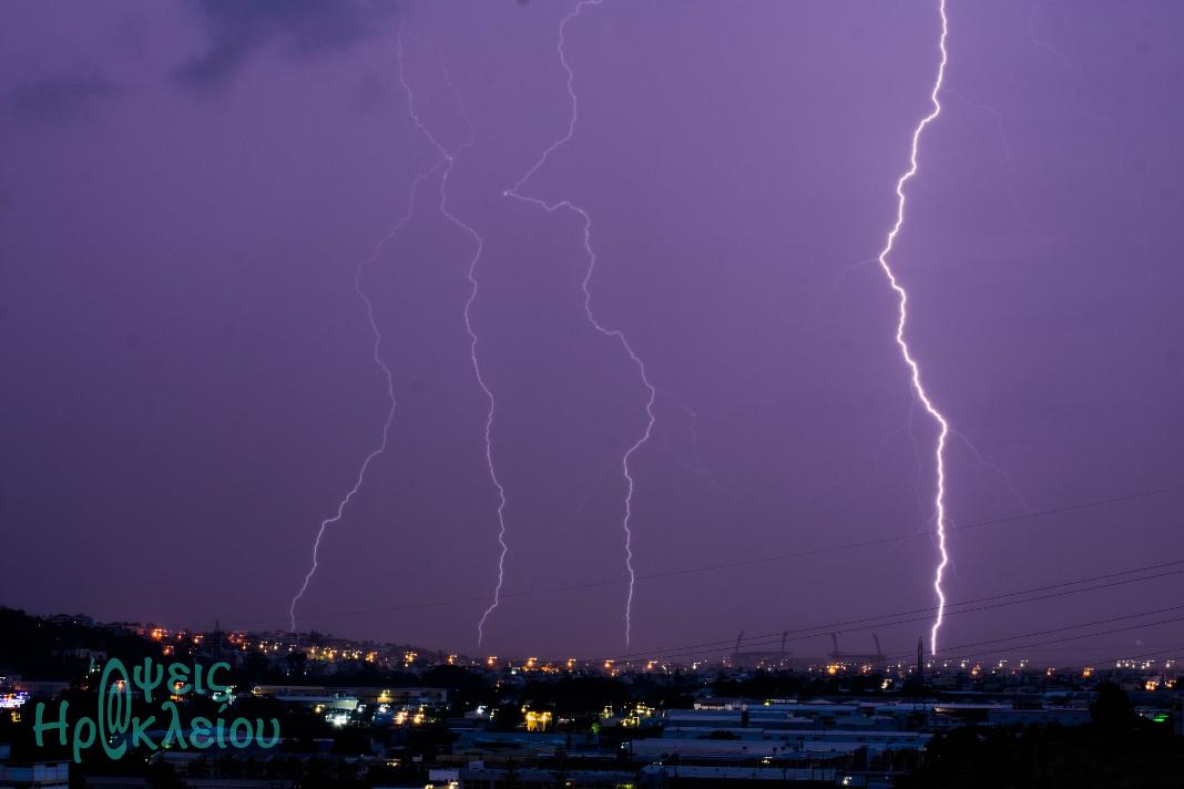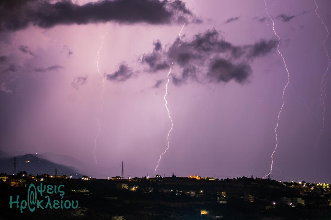 Πλήθος κεραυνών και αστραπών φώτιζαν όλο το βράδυ τον ουρανό του Ηρακλείου, δημιουργώντας εντυπωσιακούς σχηματισμούς με τις λάμψεις τους.