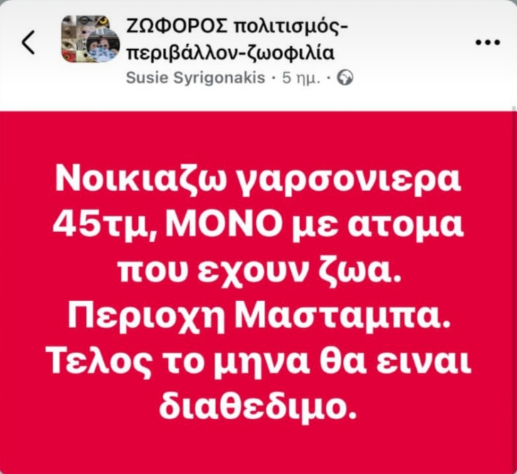 Έτσι λοιπόν στην αγγελία της έθεσε ως βασική προϋπόθεση οι υποψήφιοι ενοικιαστές της γκαρσονιέρας που διαθέτει στην περιοχή του Μασταμπά, να έχουν κατοικίδια.