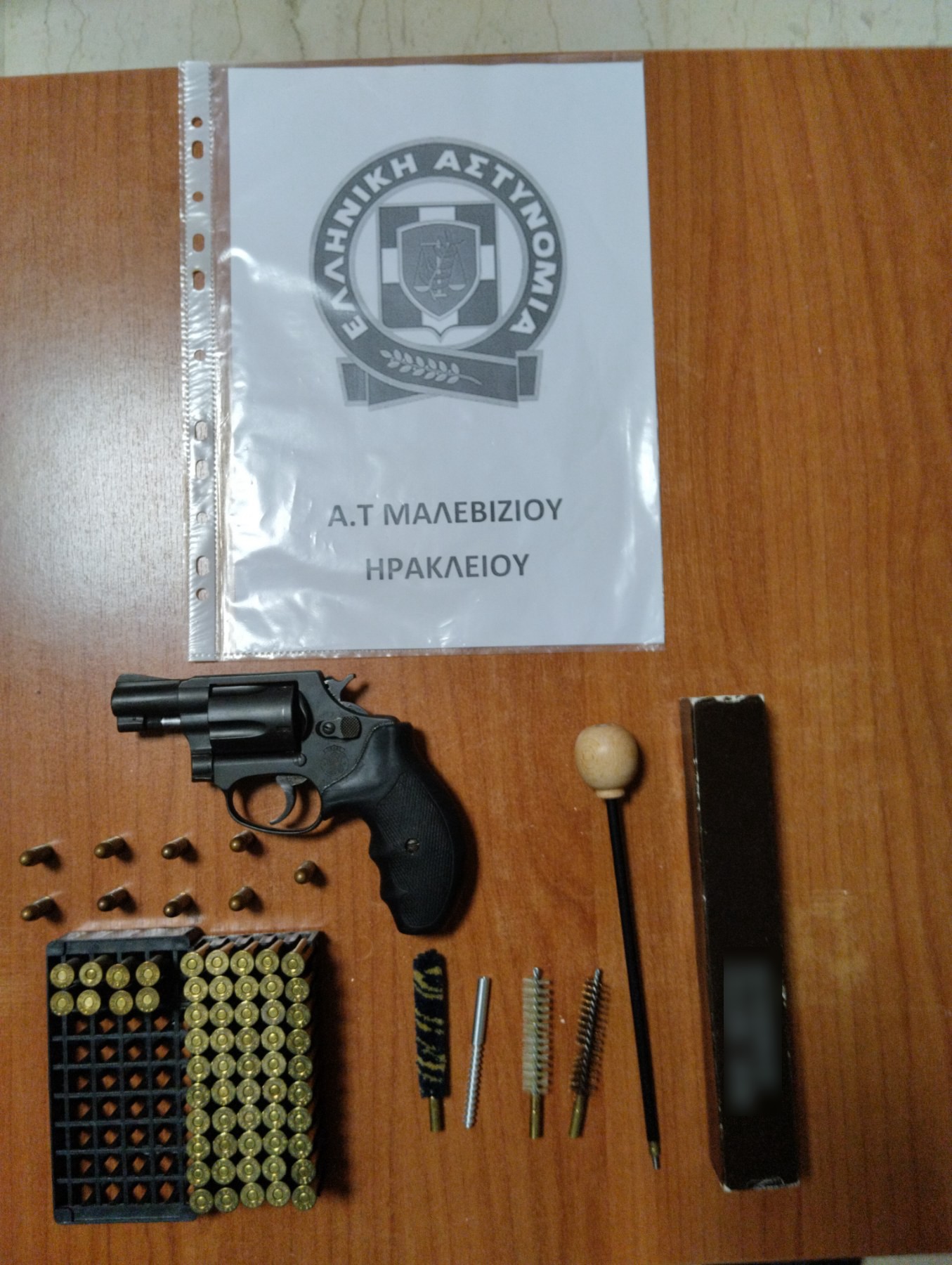 Ειδικότερα, στο πλαίσιο στοχευμένων ενεργειών και ειδικών δράσεων, που εκπονεί η Διεύθυνση Αστυνομίας Ηρακλείου για την καταπολέμηση της παράνομης οπλοκατοχής, χθες το απόγευμα από αστυνομικούς του Αστυνομικού Τμήματος Μαλεβιζίου σε συνεργασία με αστυνομικούς της Ομάδας Δίκυκλης Αστυνόμευσης Ηρακλείου του Τμήματος Άμεσης Δράσης Ηρακλείου, πραγματοποιήθηκε έρευνα στο σπίτι του άνδρα όπου βρέθηκαν και κατασχέθηκαν: