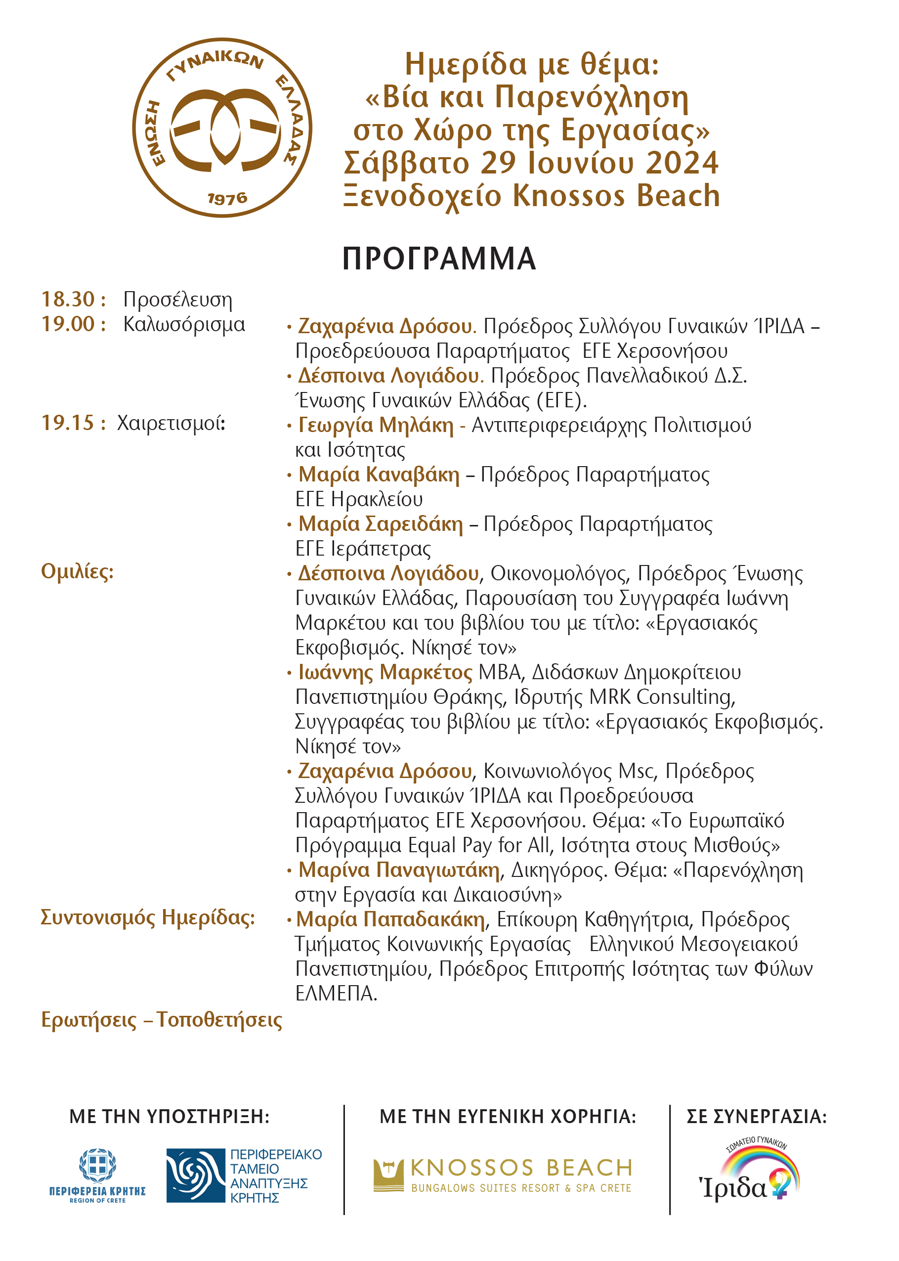 Όπως αναφέρεται σε σχετική ανακοίνωση: «Η Ημερίδα πραγματοποιείται με την Υποστήριξη της Περιφέρειας Κρήτης και για το λόγο αυτό ευχαριστούμε πολύ τον Περιφερειάρχη Κρήτης κ. Σταύρο Αρναουτάκη και την Αντιπεριφερειάρχη Πολιτισμού και Ισότητας κ. Γεωργία Μηλάκη. Η Hμερίδα διοργανώνεται σε συνεργασία με το Σύλλογο Γυναικών ΊΡΙΔΑ και την ευγενική χορηγία του Ξενοδοχείου KNOSSOS BEACH.