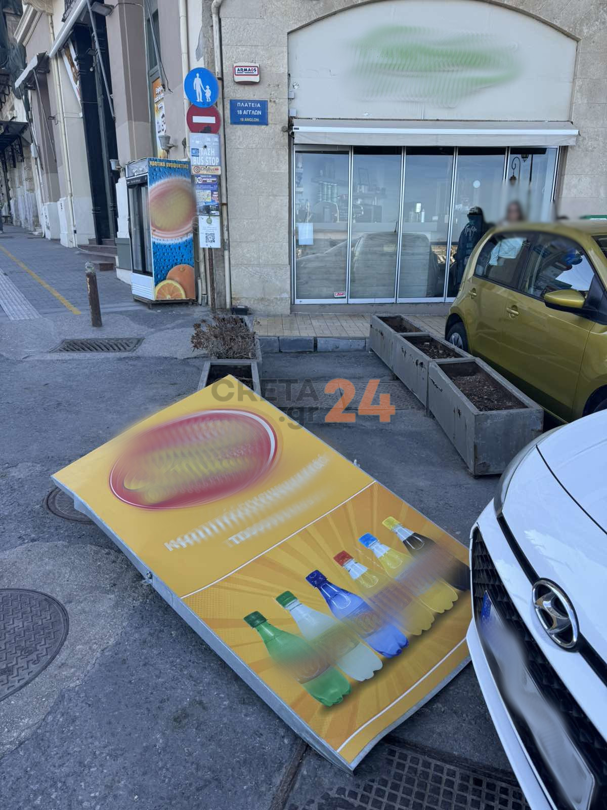 Το καπάκι λαμαρίνας προσγειώθηκε στις ζαρντινιέρες που βρίσκονται μπροστά από το κατάστημα, προκαλώντας φθορές και σε ένα σταθμευμένο αυτοκίνητο.