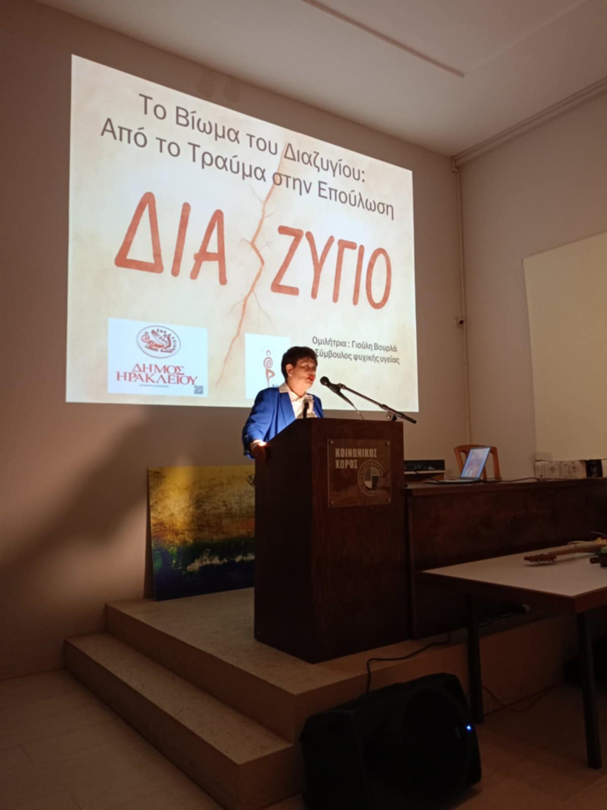 Κέρδισε το ενδιαφέρον του κοινού η ομιλία με θέμα «Το Βίωμα του Διαζυγίου-Από το Τραύμα στην Επούλωση» που διοργάνωσε η Αντιδημαρχία Εθελοντισμού του Δήμου Ηρακλείου σε συνεργασία με τη Σύμβουλο Ψυχικής Υγείας Γιούλη Βουρλά στον Κοινωνικό Χώρο των Ιδρυμάτων Καλοκαιρινού.