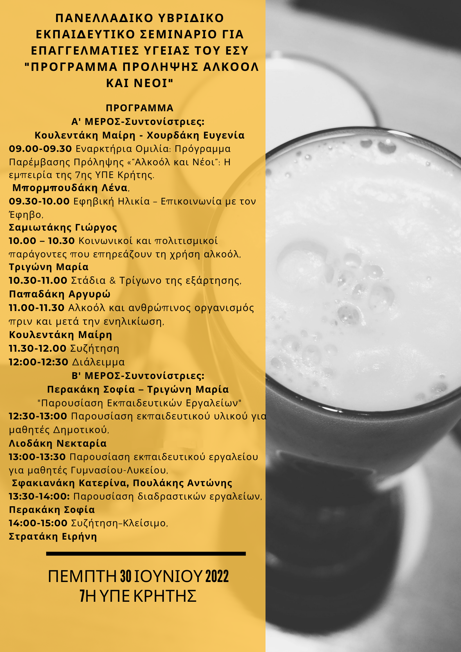 Στο πλαίσιο της επιμόρφωσης των επαγγελματιών μονάδων υγείας του ΕΣΥ σε συγκεκριμένες δράσεις/παρεμβάσεις στον μαθητικό πληθυσμό και την κοινότητα, η 7η ΥΠΕ Κρήτης διοργανώνει το πρώτο Πανελλήνιο εκπαιδευτικό σεμινάριο, με θέμα «ΠΡΟΓΡΑΜΜΑ ΠΡΟΛΗΨΗΣ “ΑΛΚΟΟΛ και ΝΕΟΙ”».