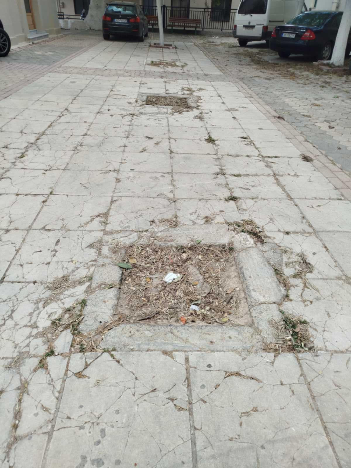 Ο ίδιος σημειώνει ότι σε όλο το μήκος της πλατείας, οι πλάκες έχουν θρυμματιστεί, σε άλλα σημεία έχουν φουσκώσει και σχηματίζουν λόφο πάνω από το έδαφος, αλλού ο κυβόλιθος έχει ξεκολλήσει… Προφανώς, το πρόβλημα δεν είναι μόνο αισθητικό αλλά κυρίως χρηστικό, διότι η πλατεία με την μακροχρόνια εγκατάλειψή της έχει μετατραπεί σε ναρκοπέδιο προβλημάτων. Και το χειρότερο από όλα -όπως εξηγεί- είναι ότι δυστυχώς η εικόνα αυτή διαιωνίζεται χρόνια τώρα, και παρά τις αλλεπάλληλες εκκλήσεις μας δεν έχει υπάρξει ένα σχέδιο αποκατάστασης.
